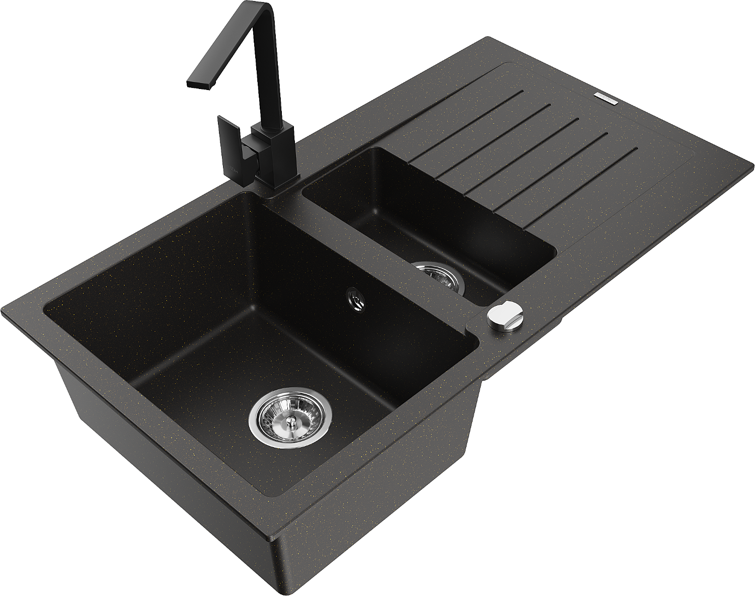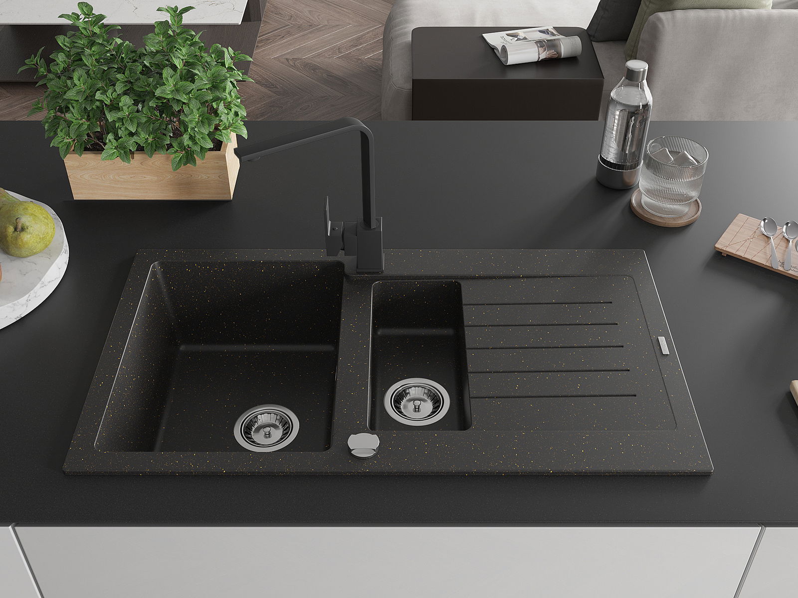 Mexen Matias lavello in granito 1,5 vasche con scolapiatti e miscelatore cucina Rita, nero/oro - 6502-75-670300-70