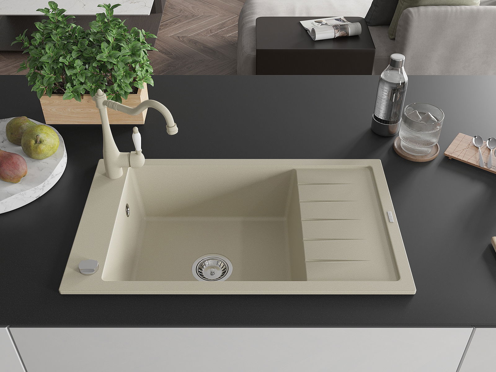 Il lavello è realizzato in granito di alta qualità. Rappresenta un complemento elegante e, soprattutto, pratico per ogni cucina, indipendentemente dal suo stile. L'alta qualità e la durata del granito garantiscono un utilizzo che dura per molti anni.