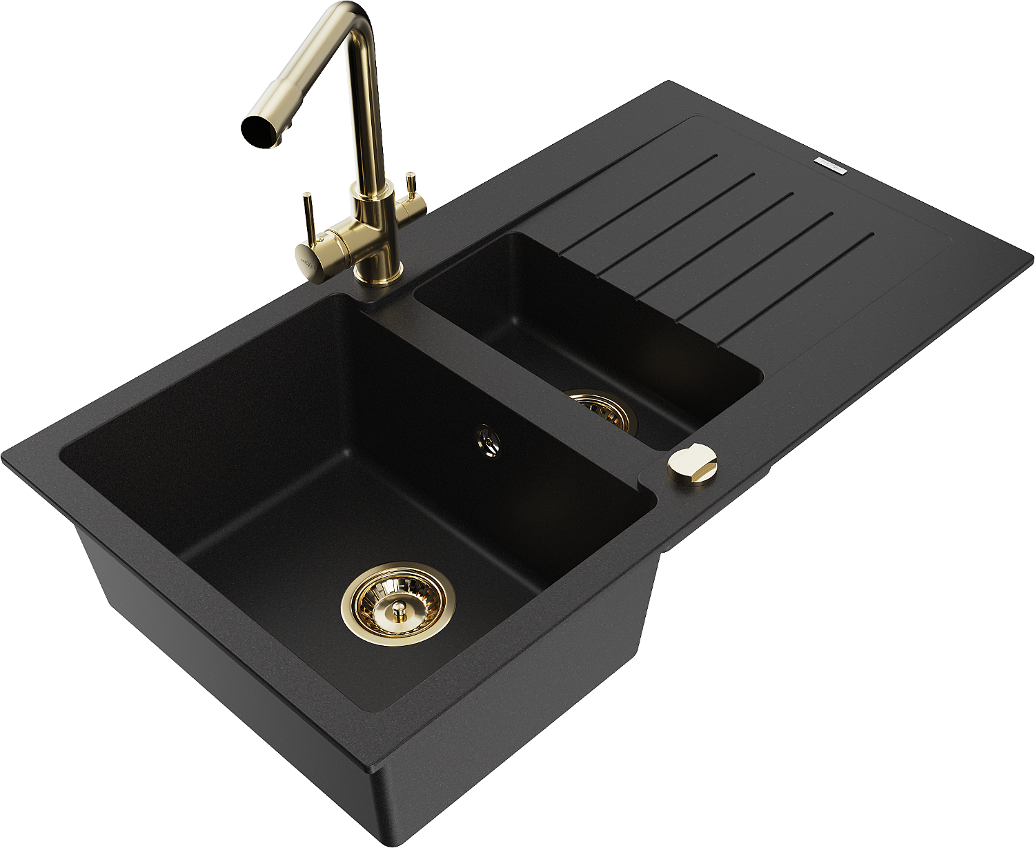 Mexen Matias lavello in granito 1,5 vasca con sgocciolatoio e rubinetto da cucina Duero, nero - 6502-77-671600-50