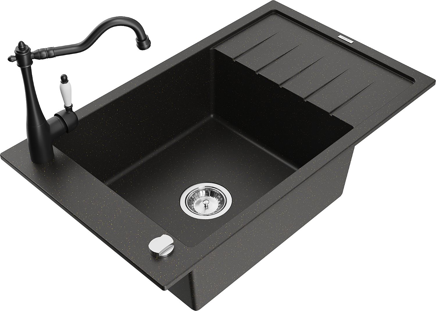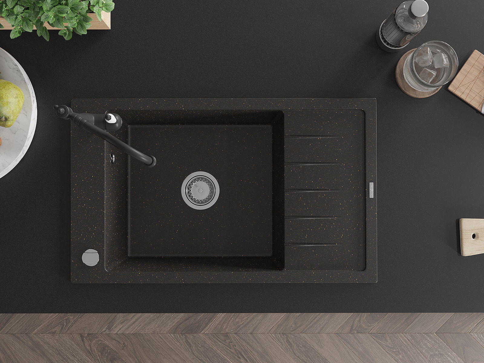 Mexen Elias lavello in granito a una vasca con scolapiatti e rubinetto da cucina Carla, nero/oro metallizzato
