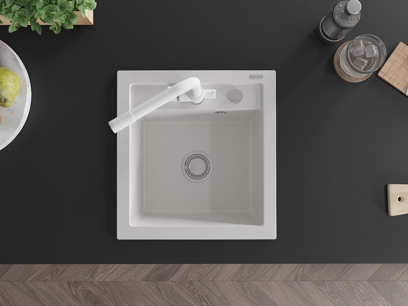Il lavello ha un foro fresato di 35 mm di diametro da sfondare autonomamente. Può essere utilizzato, tra l'altro, per montare un dosatore di liquidi, che eliminerà la presenza di bottiglie di plastica in cucina e conferirà un tocco di eleganza.