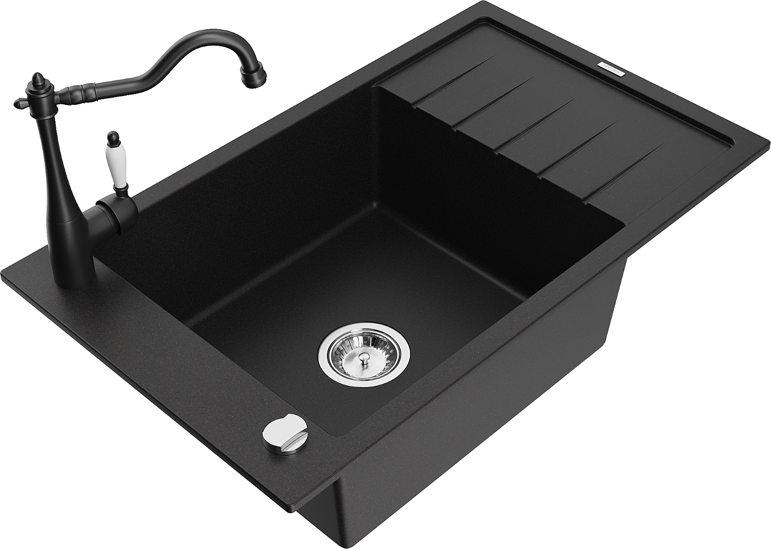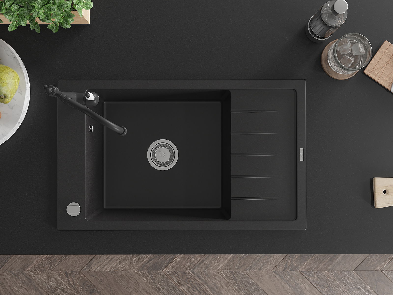 Mexen Elias lavello da cucina in granito a 1 vasca con scolapiatti e rubinetto da cucina Carla, nero - 6511-77-670700-70