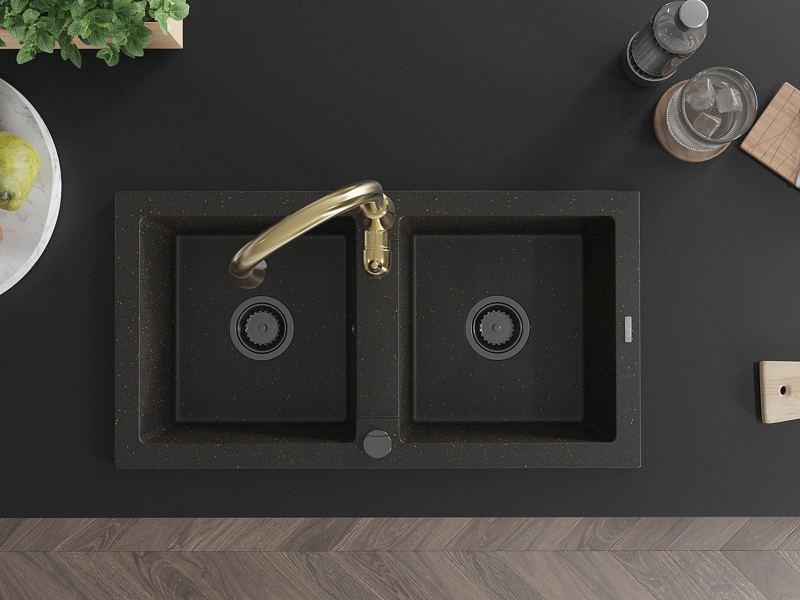 Mexen Mario lavello da cucina in granito a 2 vasche con miscelatore Savita, nero/oro metallizzato - 6504-75-672601-50-B