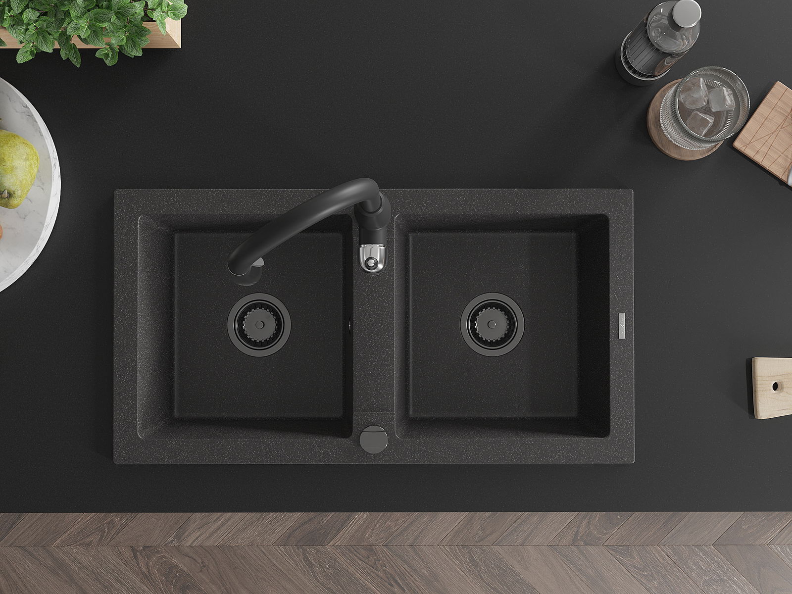 Mexen Mario lavello da cucina in granito a 2 vasche con miscelatore Savita, nero maculato - 6504-76-672601-70-B