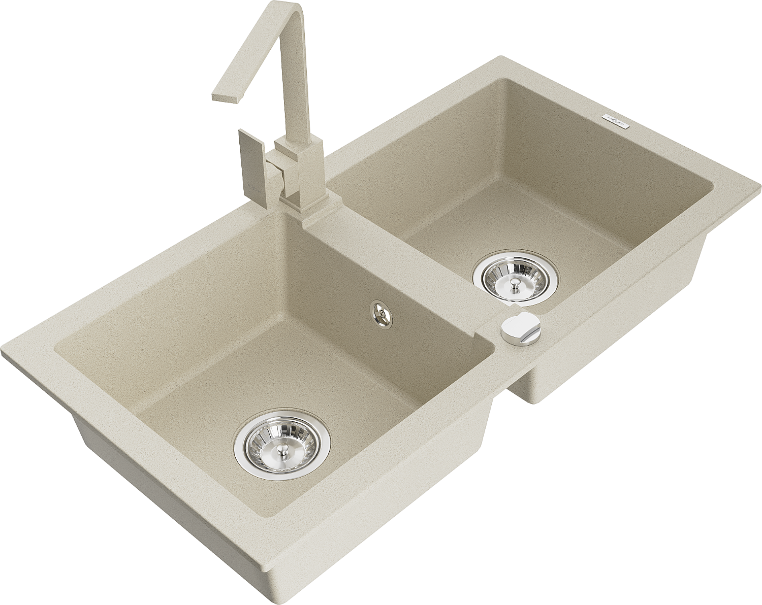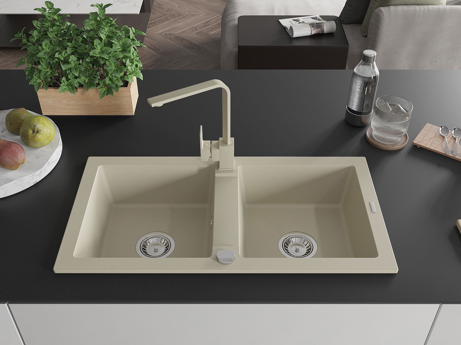 Mexen Mario lavello in granito a 2 vasche con rubinetto da cucina Rita, beige - 6504-69-670300-69