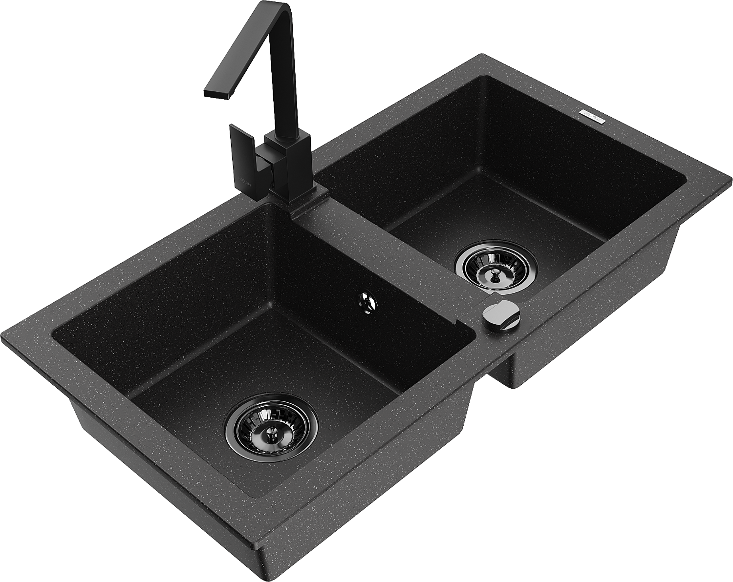 Mexen Mario lavello da cucina in granito a 2 vasche con rubinetto da cucina Rita, nero/metallico argento - 6504-73-670300-70-B