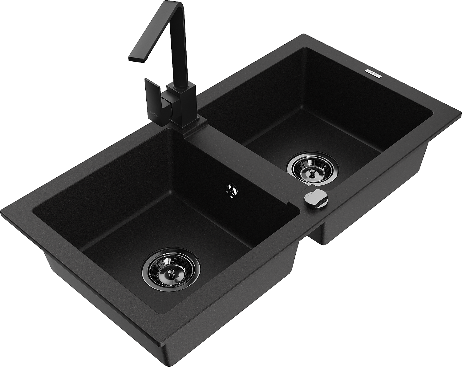 Mexen Mario lavello da cucina in granito a 2 vasche con rubinetto Rita, nero - 6504-77-670300-70-B