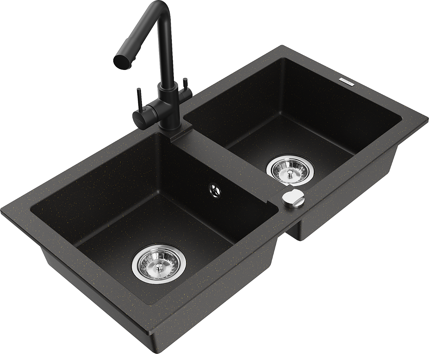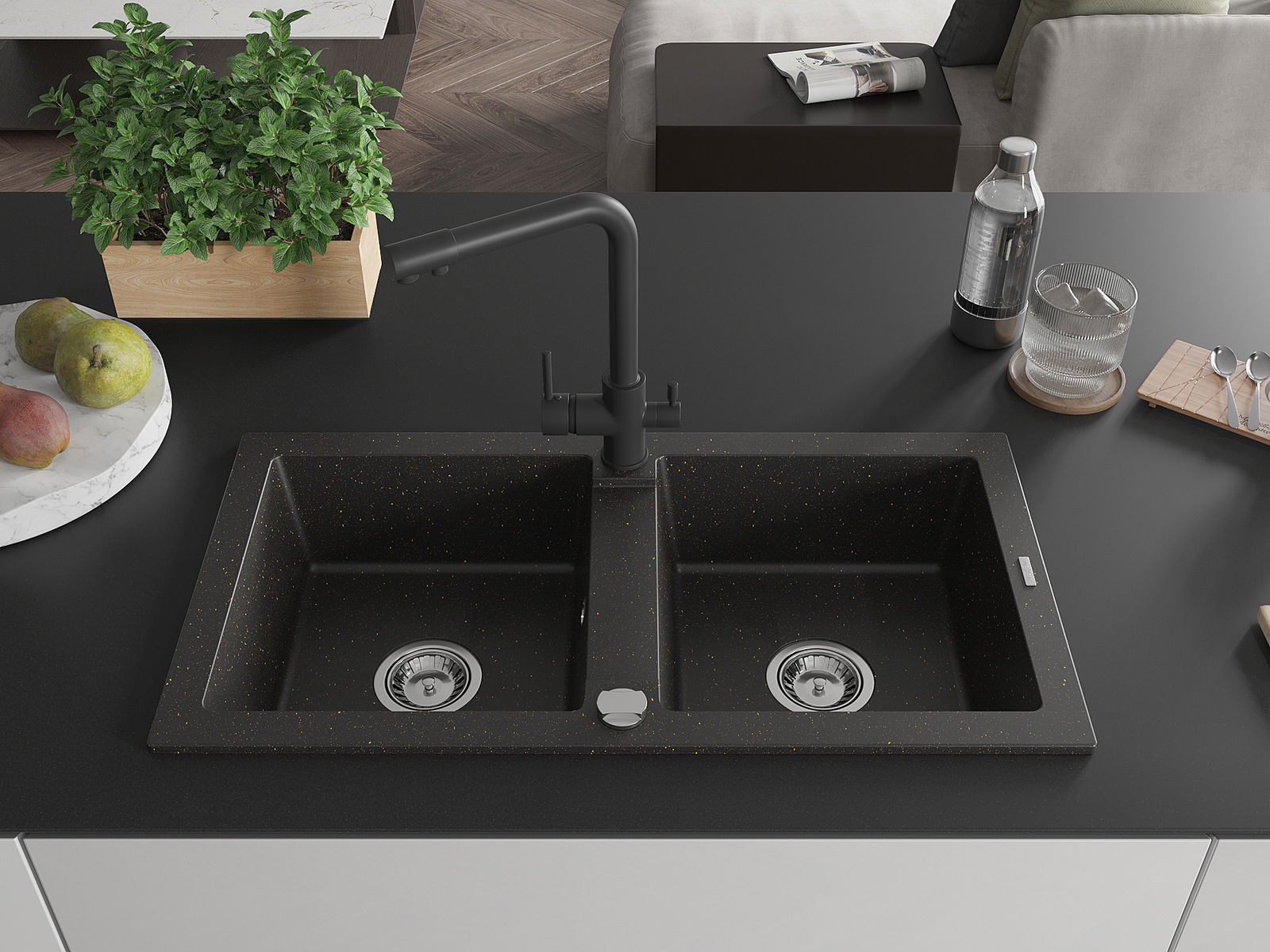 Mexen Mario lavello in granito a 2 vasche con rubinetto da cucina Duero, nero/oro metallico - 6504-75-671600-70