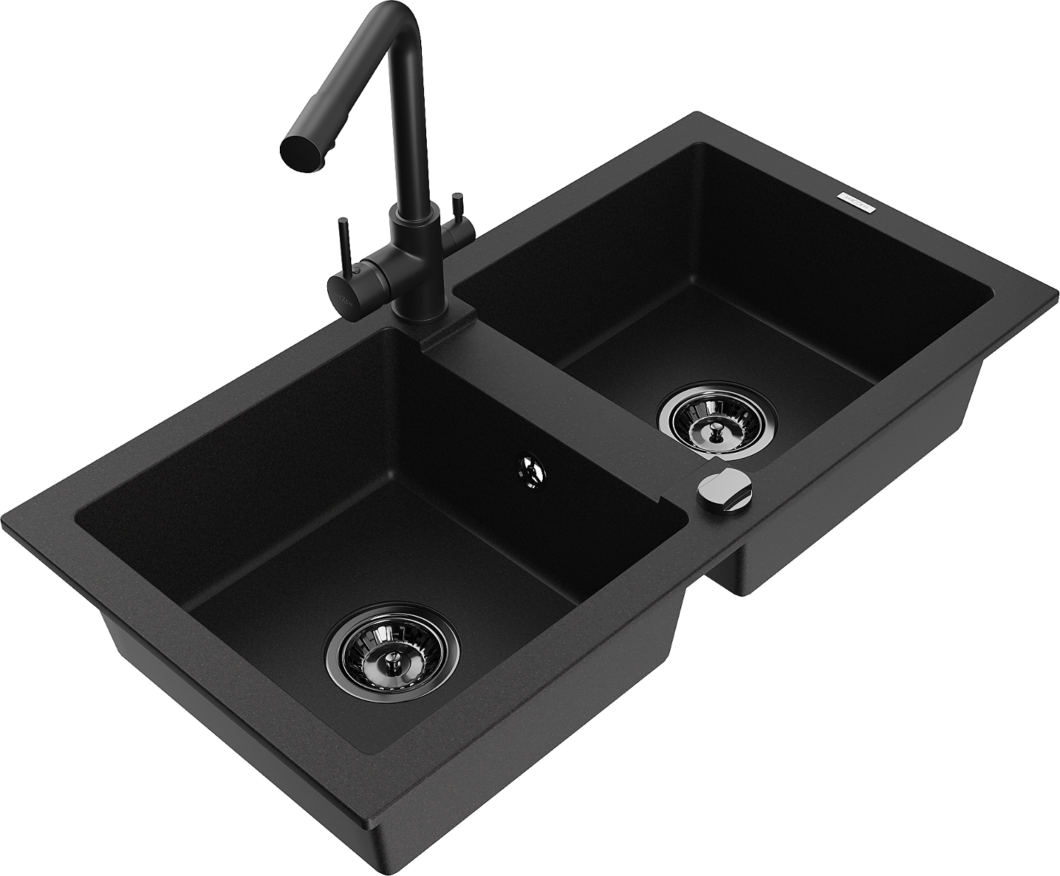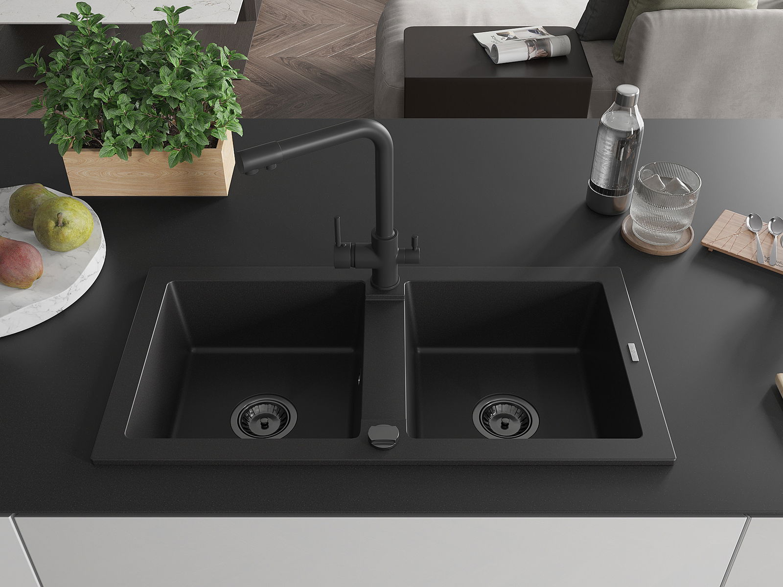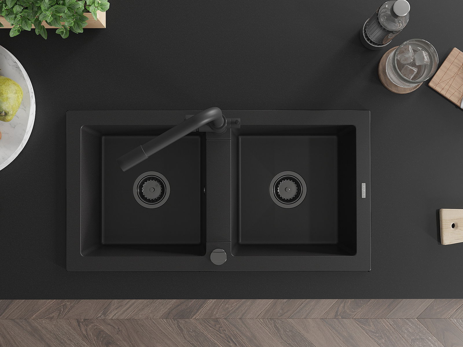 Mexen Mario lavello in granito a 2 vasche con rubinetto da cucina Duero, nero - 6504-77-671600-70-B