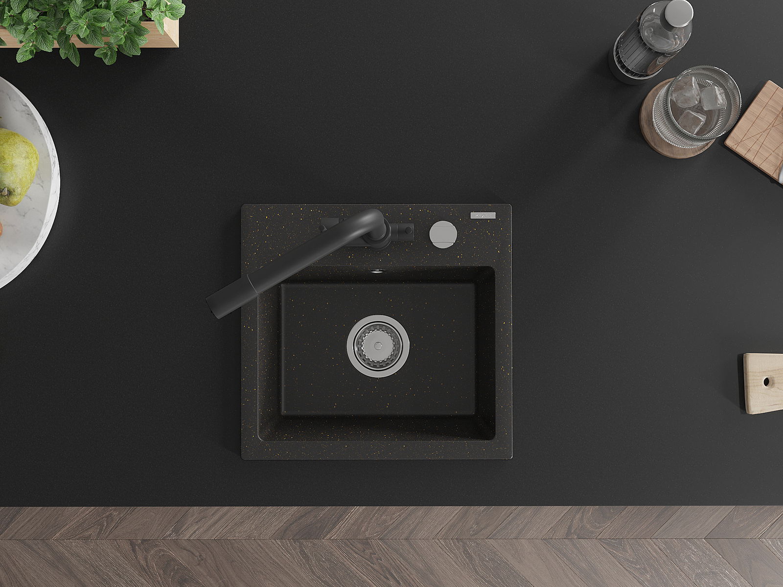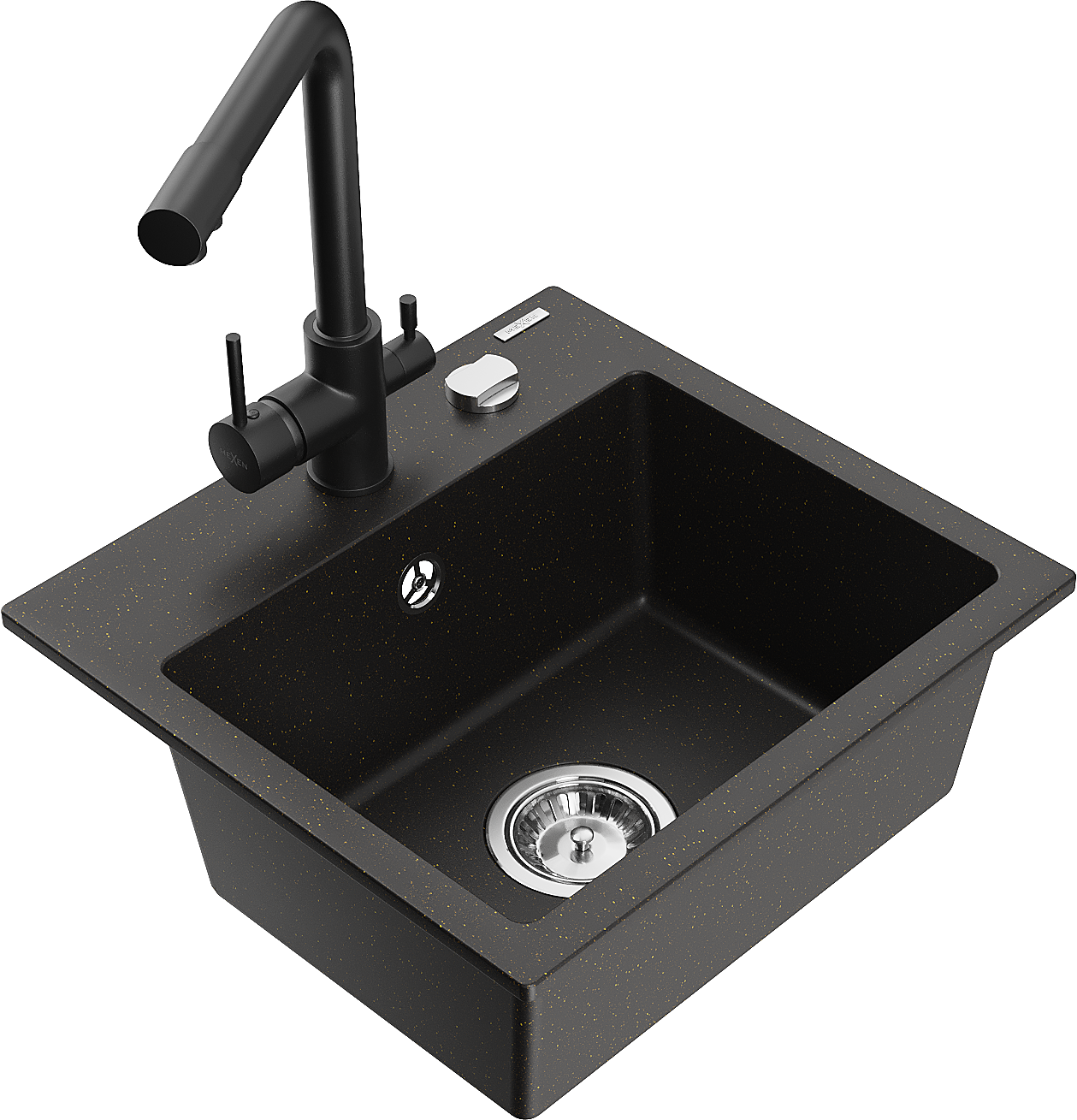 Mexen Milo lavello in granito a 1 vasca con rubinetto da cucina Duero, nero/oro metallizzato - 6505-75-671600-70