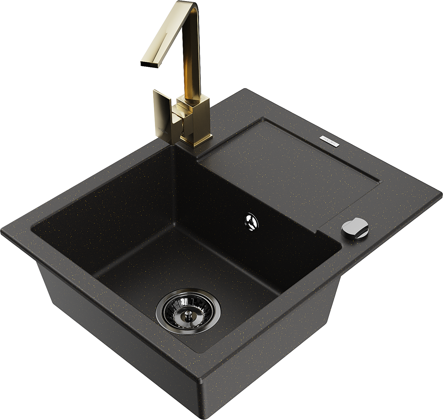 Mexen Enzo lavello in granito a 1 vasca con scolapiatti e miscelatore da cucina Rita, nero/oro metallico - 6506-75-670300-50-B