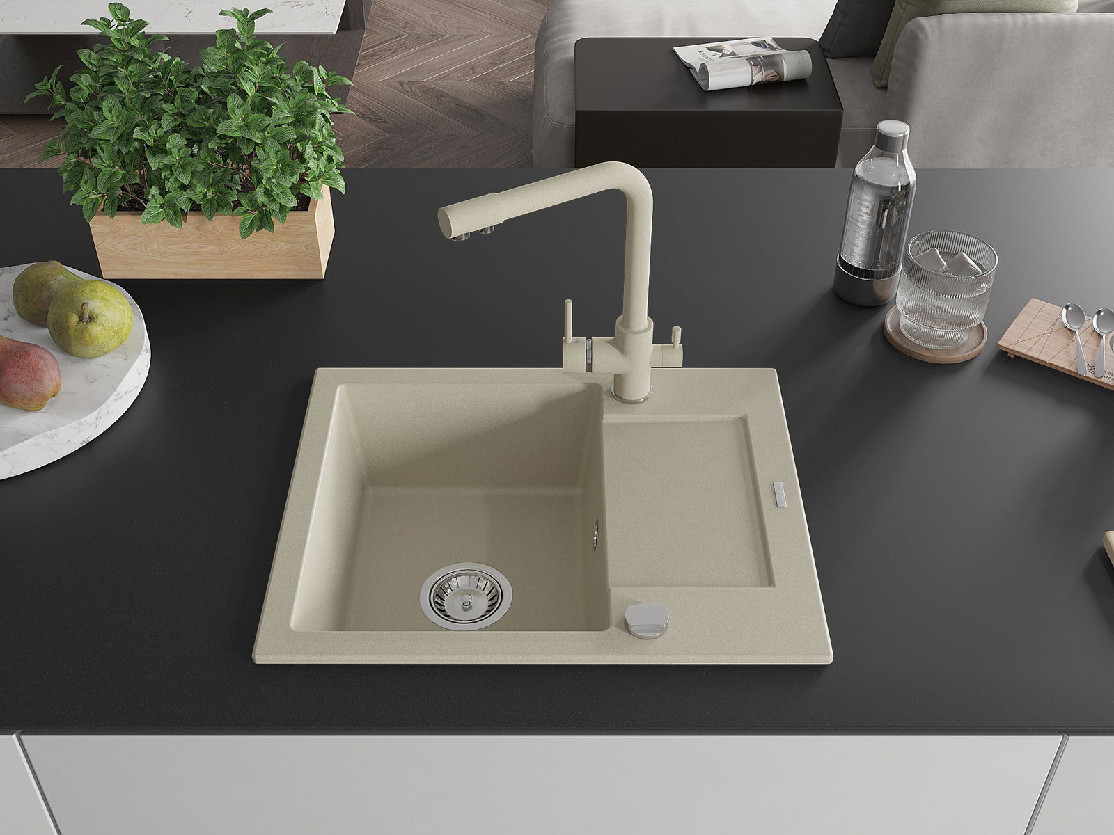 Il lavello è realizzato in granito di alta qualità. Rappresenta un complemento elegante e, soprattutto, pratico per ogni cucina, indipendentemente dal suo stile. L'alta qualità e la durata del granito garantiscono un utilizzo che dura per molti anni.