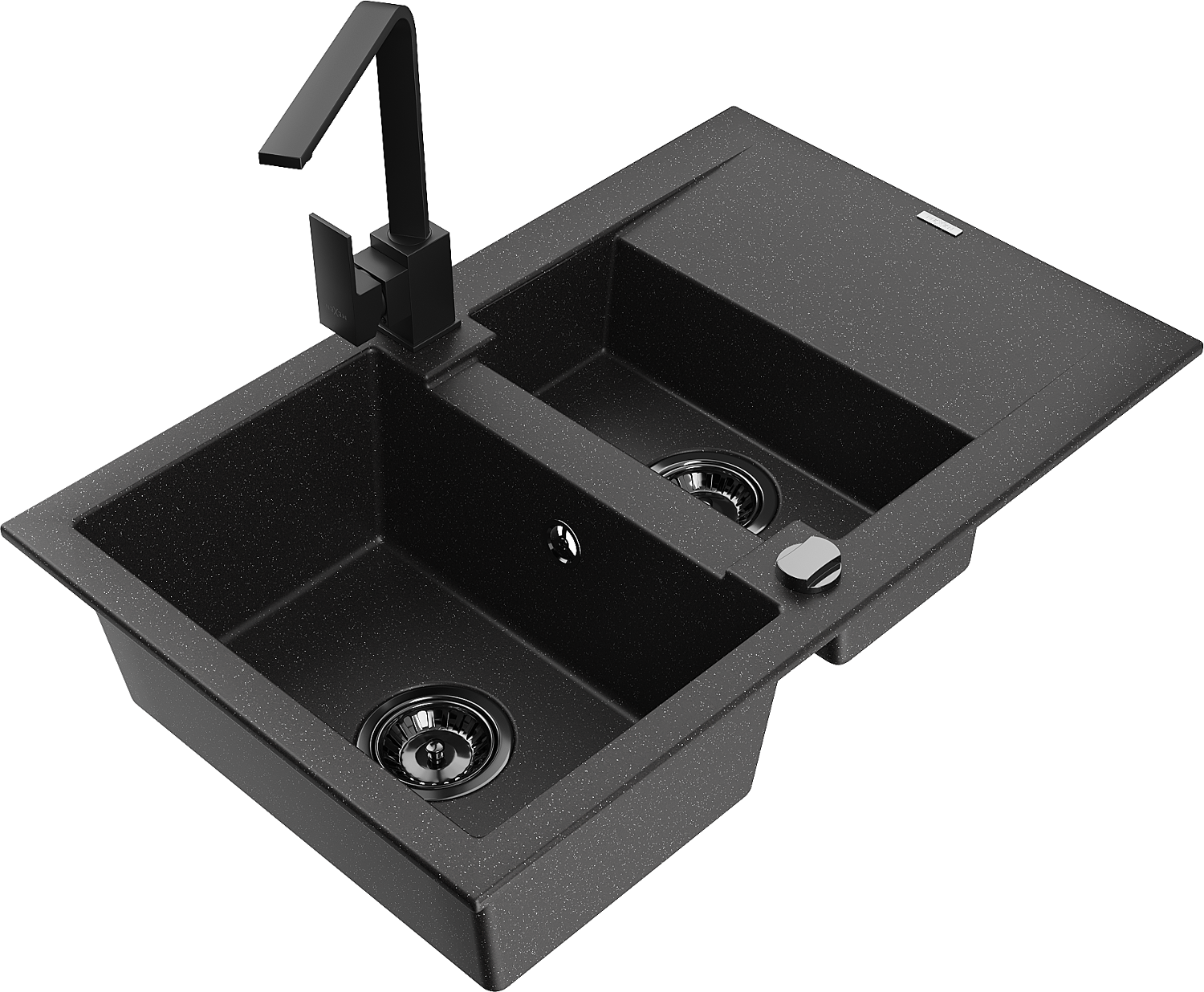 Mexen Gaspar lavello in granito 1,5 vasca con scolapiatti e rubinetto da cucina Rita, nero/argento - 6507-73-670300-70-B