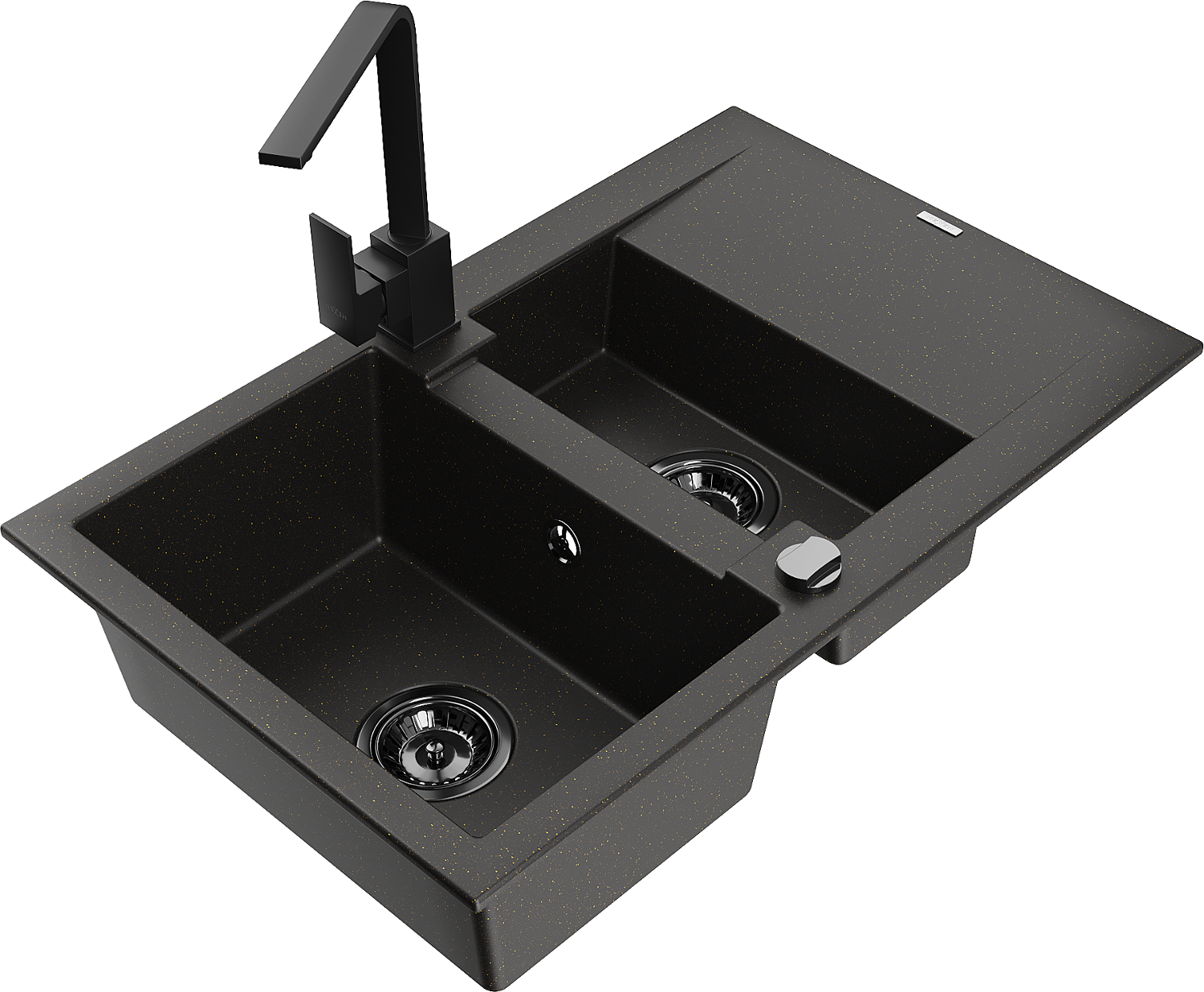 Mexen Gaspar lavello in granito 1,5 vasca con scolapiatti e rubinetto da cucina Rita, nero/oro - 6507-75-670300-70-B