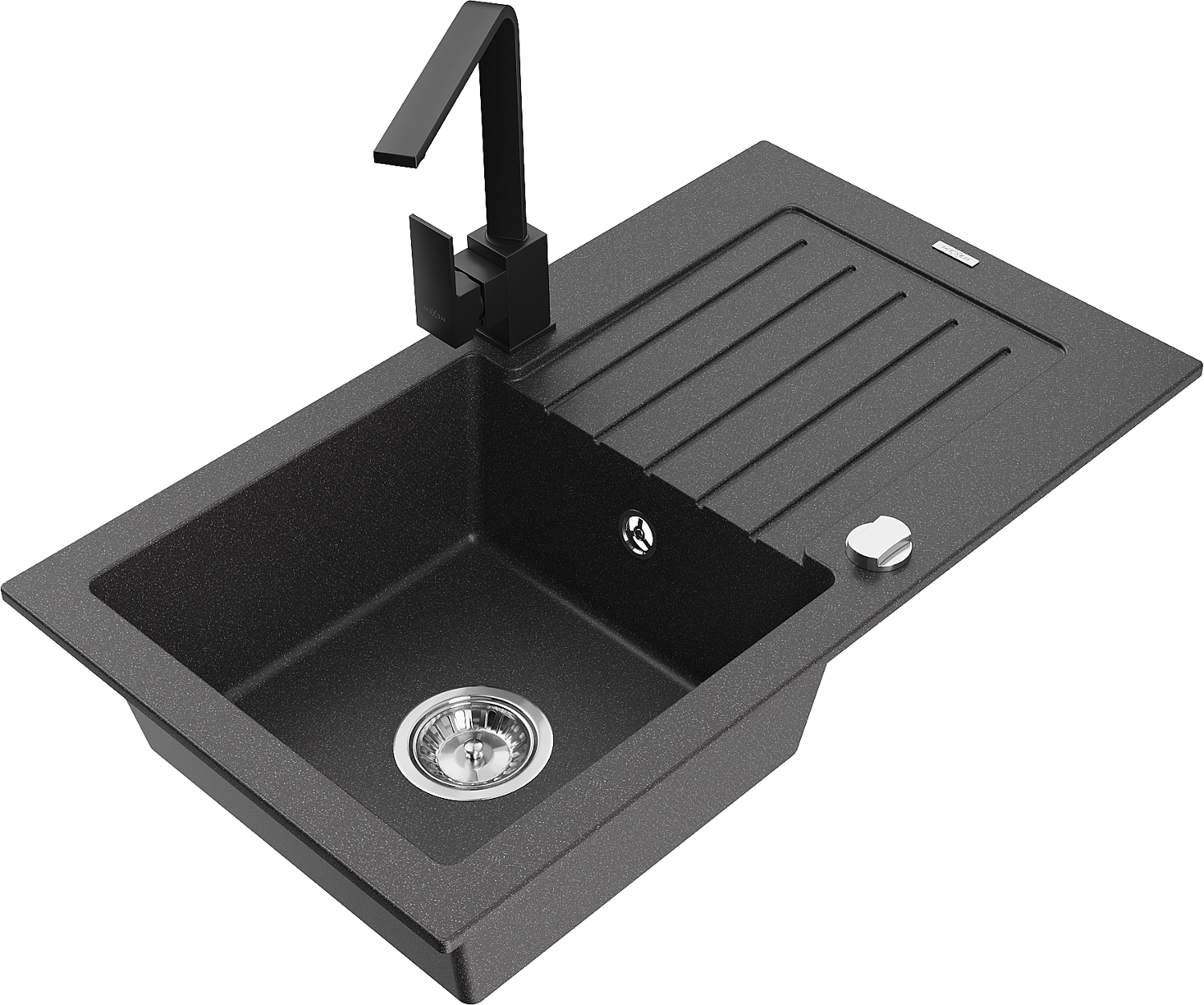 Mexen Pablo lavello in granito a 1 vasca con scolapiatti e rubinetto da cucina Rita, nero maculato- 6510-76-670300-70