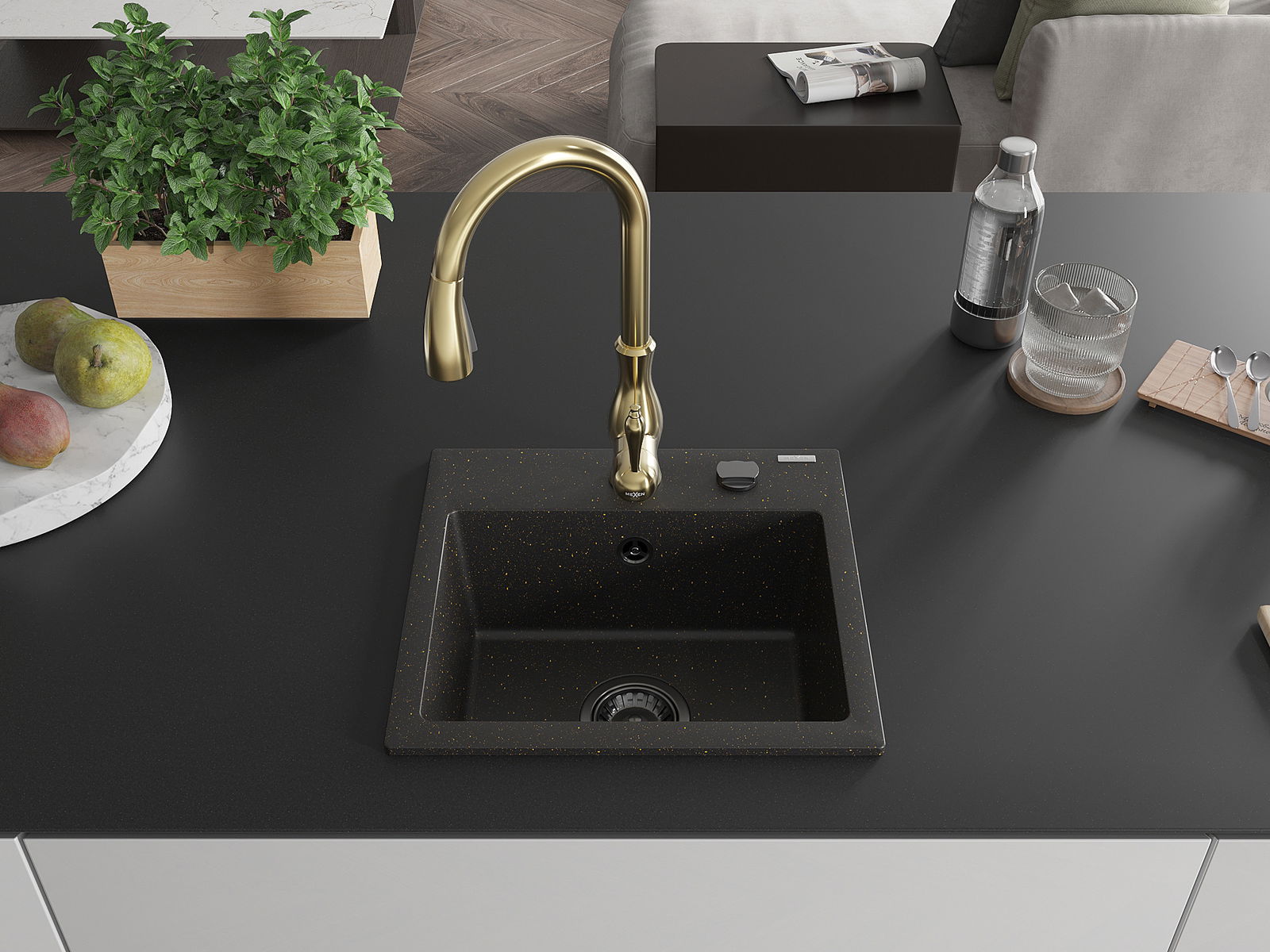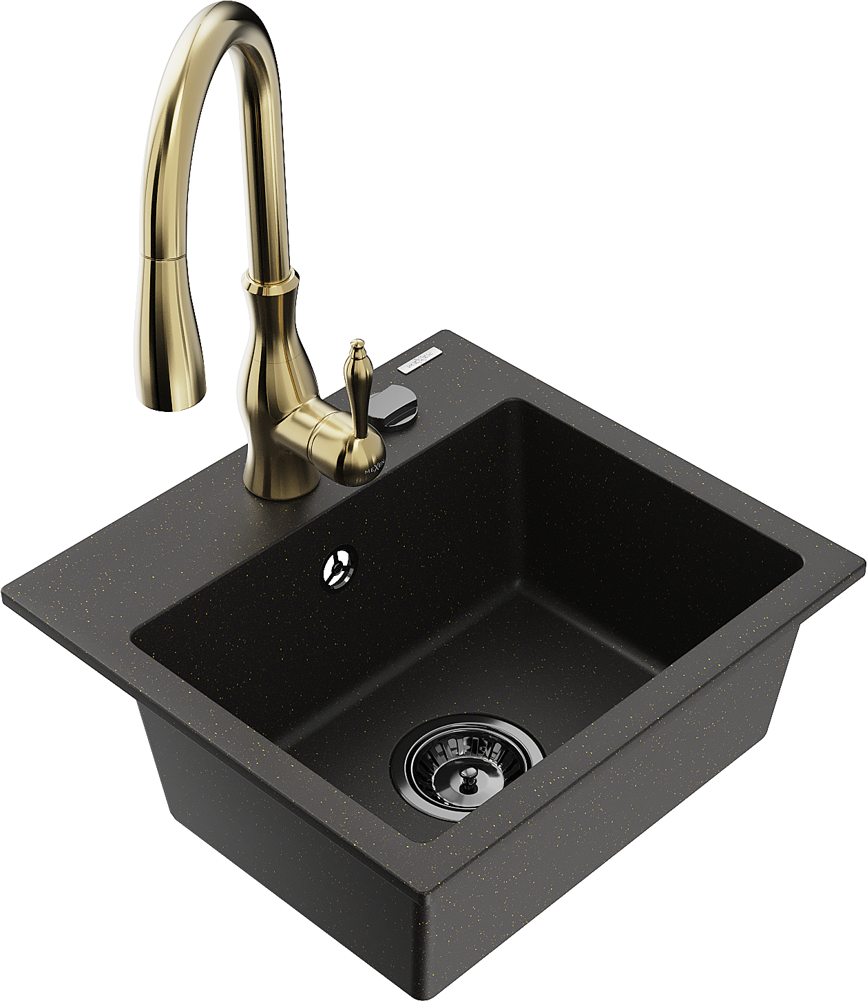 Mexen Milo lavello in granito a 1 vasca con rubinetto da cucina Savita, nero/oro metallizzato- 6505-75-672601-50-B