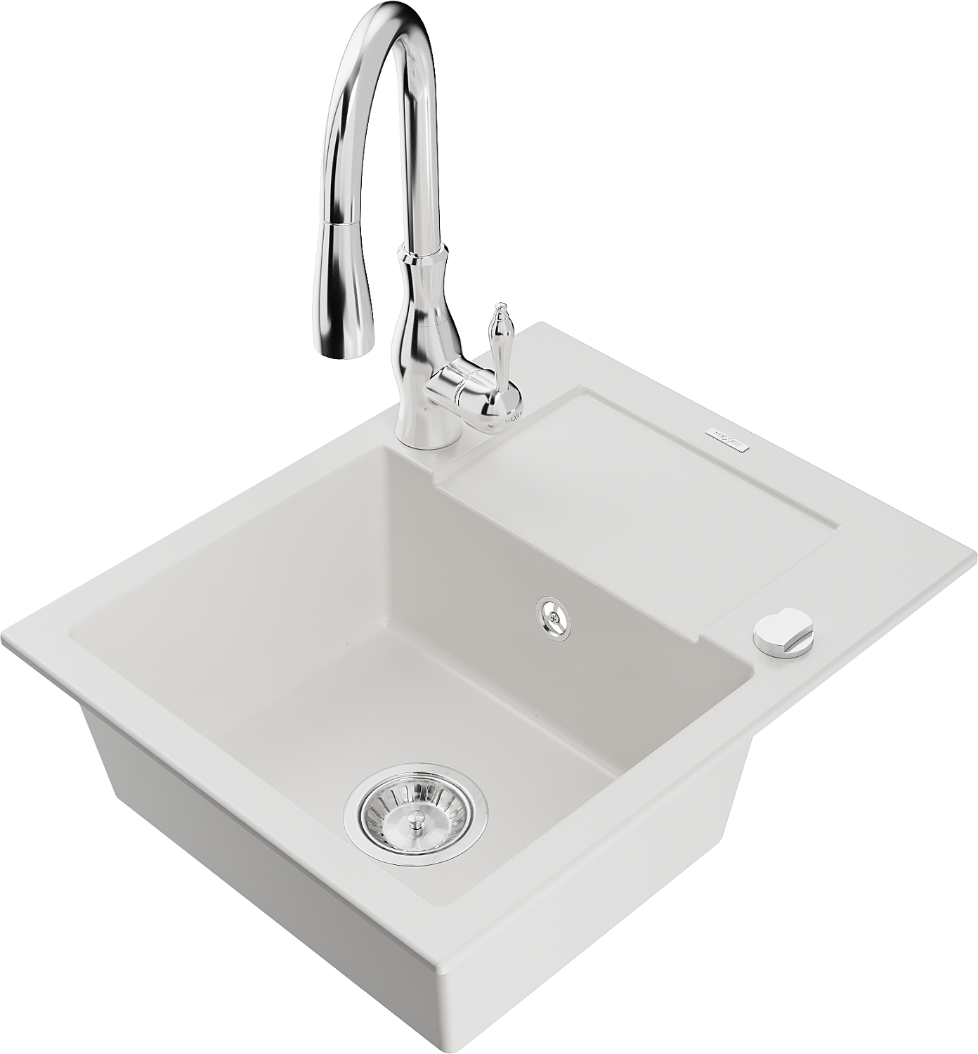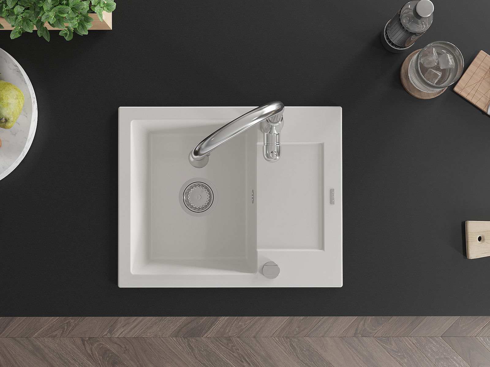Mexen Enzo lavello in granito 1 vasca con gocciolatoio e rubinetto da cucina Savita, bianco - 6506-20-672601-00