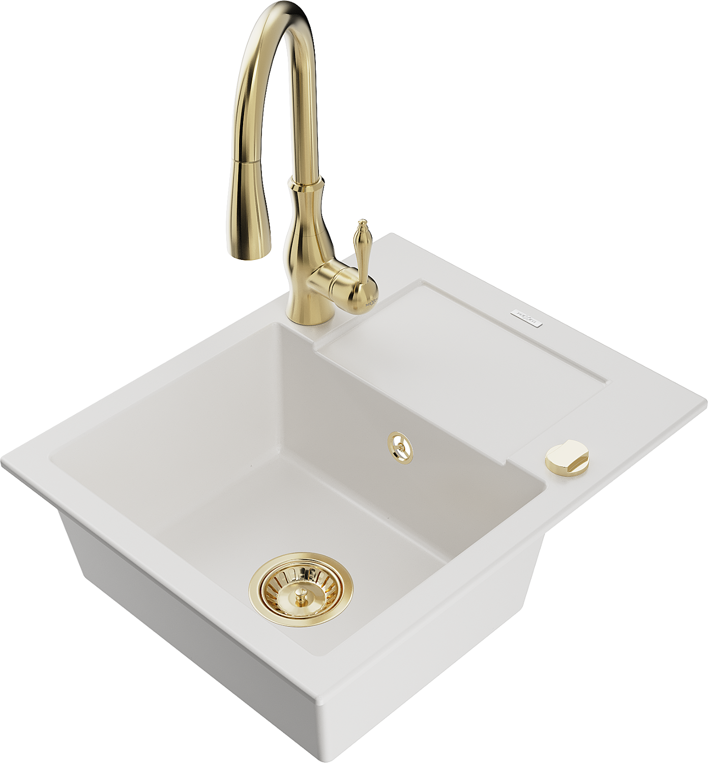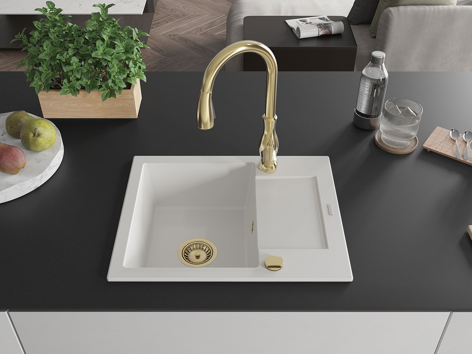 Mexen Enzo lavello in granito a 1 vasca con sgocciolatoio e rubinetto da cucina Savita, bianco - 6506-20-672601-50