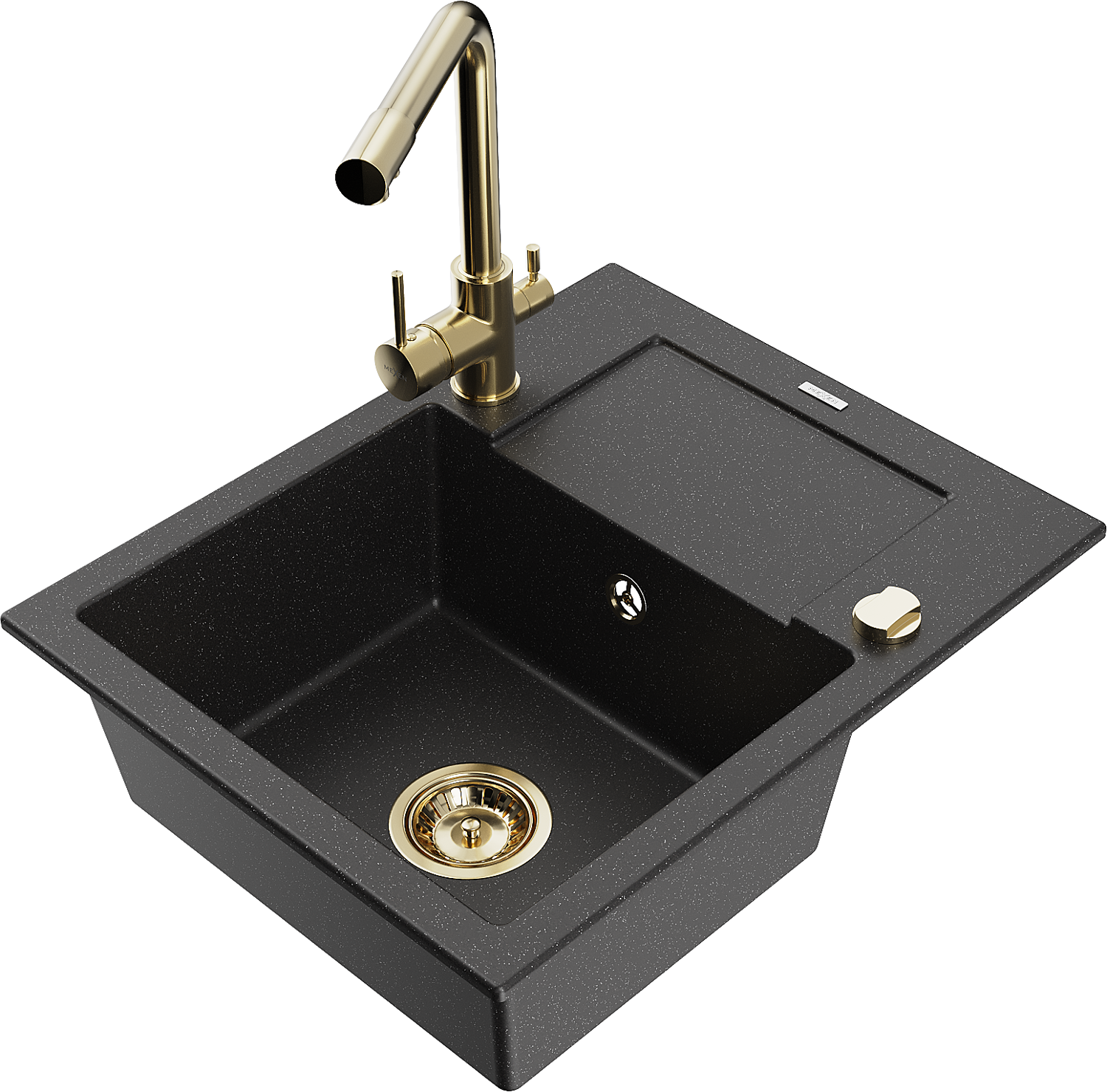 Mexen Enzo lavello in granito a 1 vasca con sgocciolatoio e rubinetto da cucina Duero, nero/metallo argento - 6506-73-671600-50