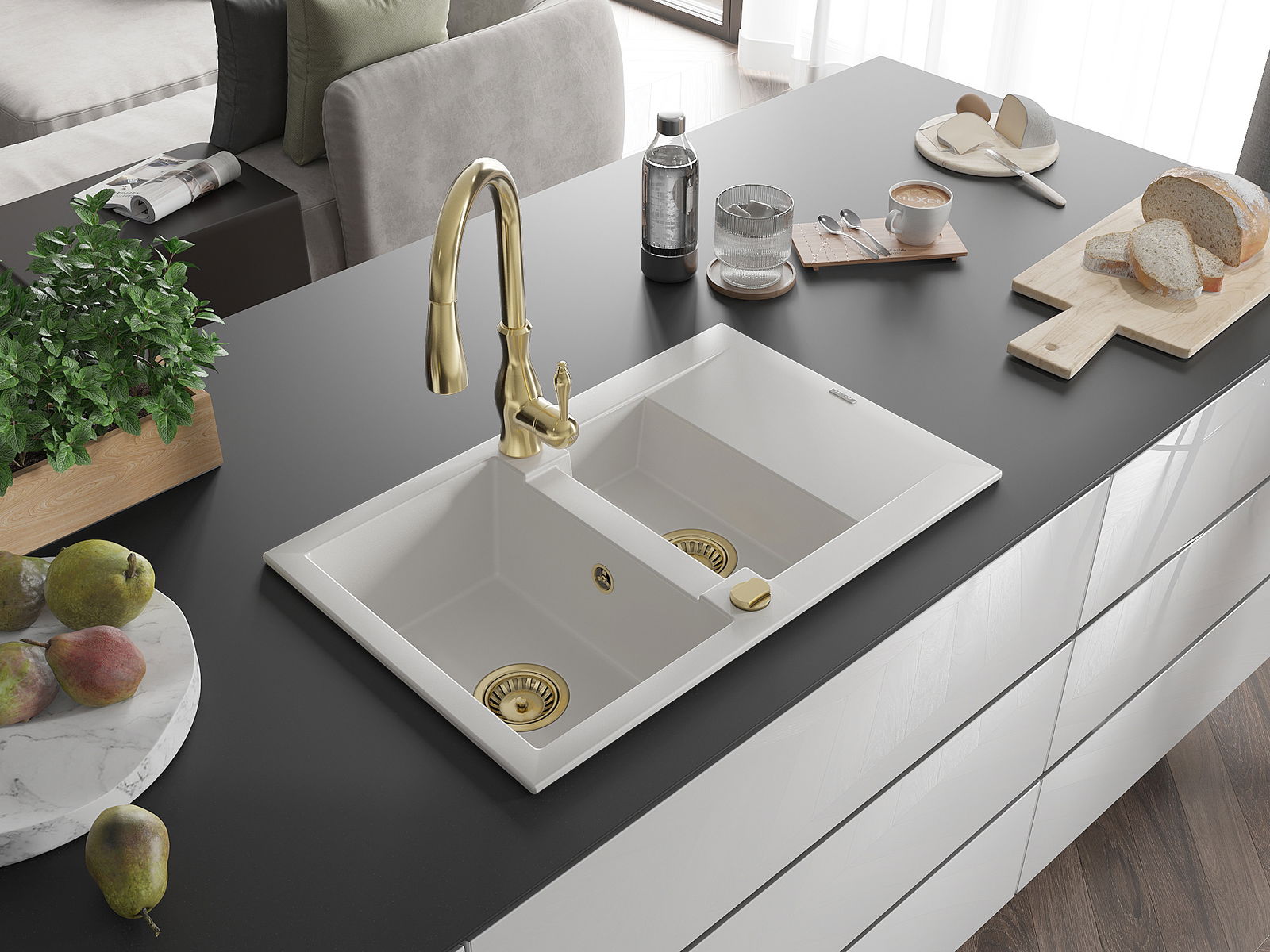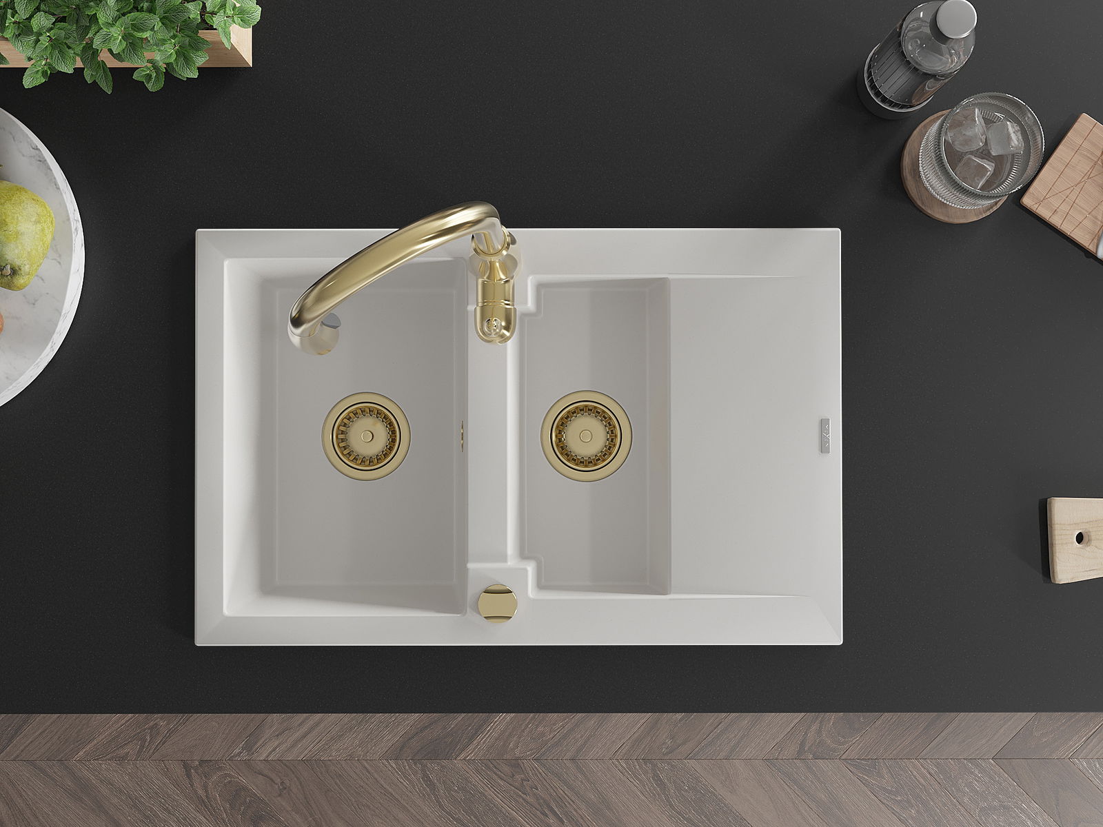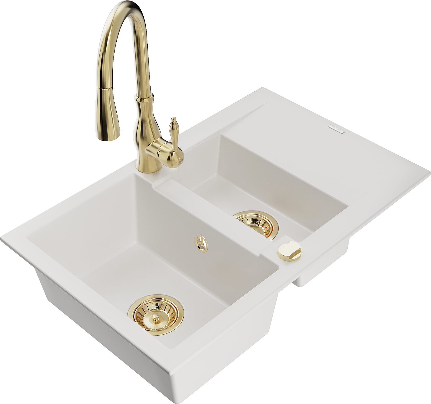 Mexen Gaspar lavello in granito 1,5 vasca con gocciolatoio e rubinetto da cucina Savita, bianco - 6507-20-672601-50