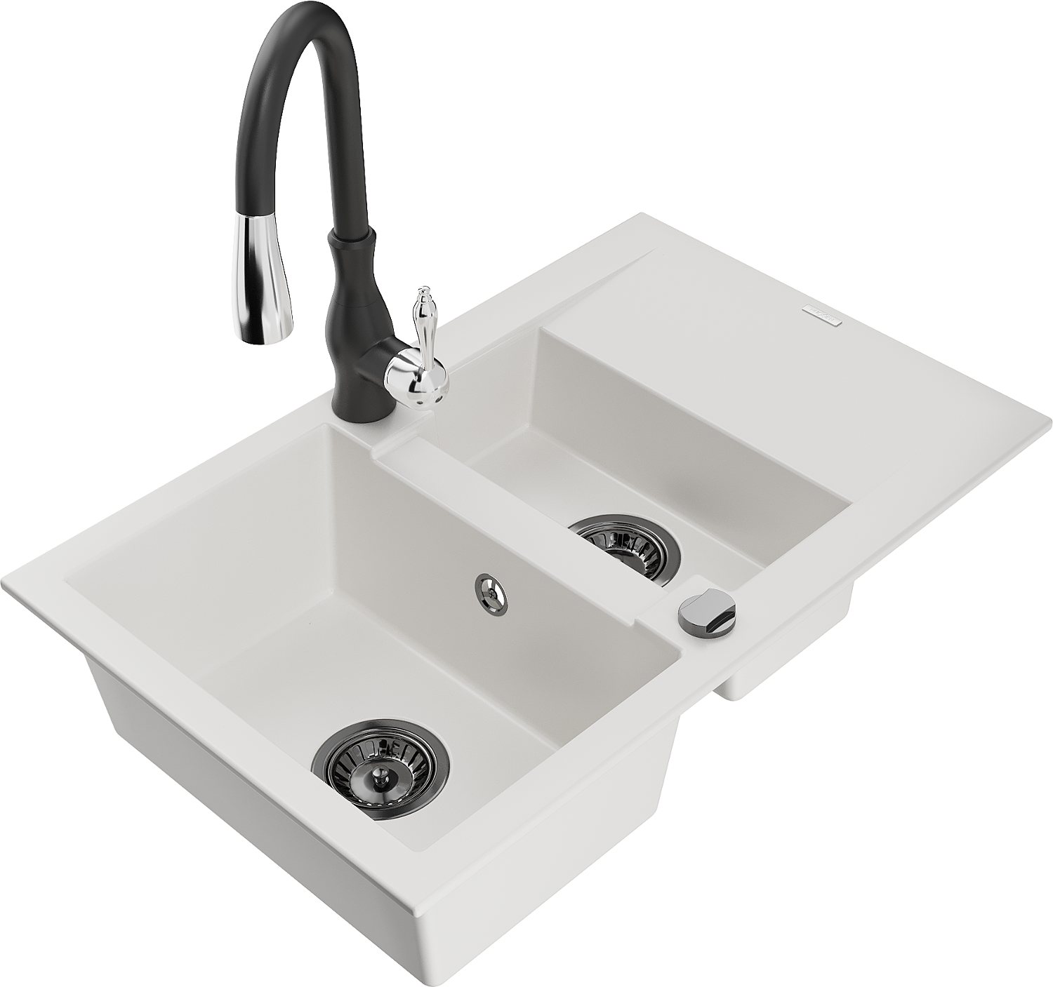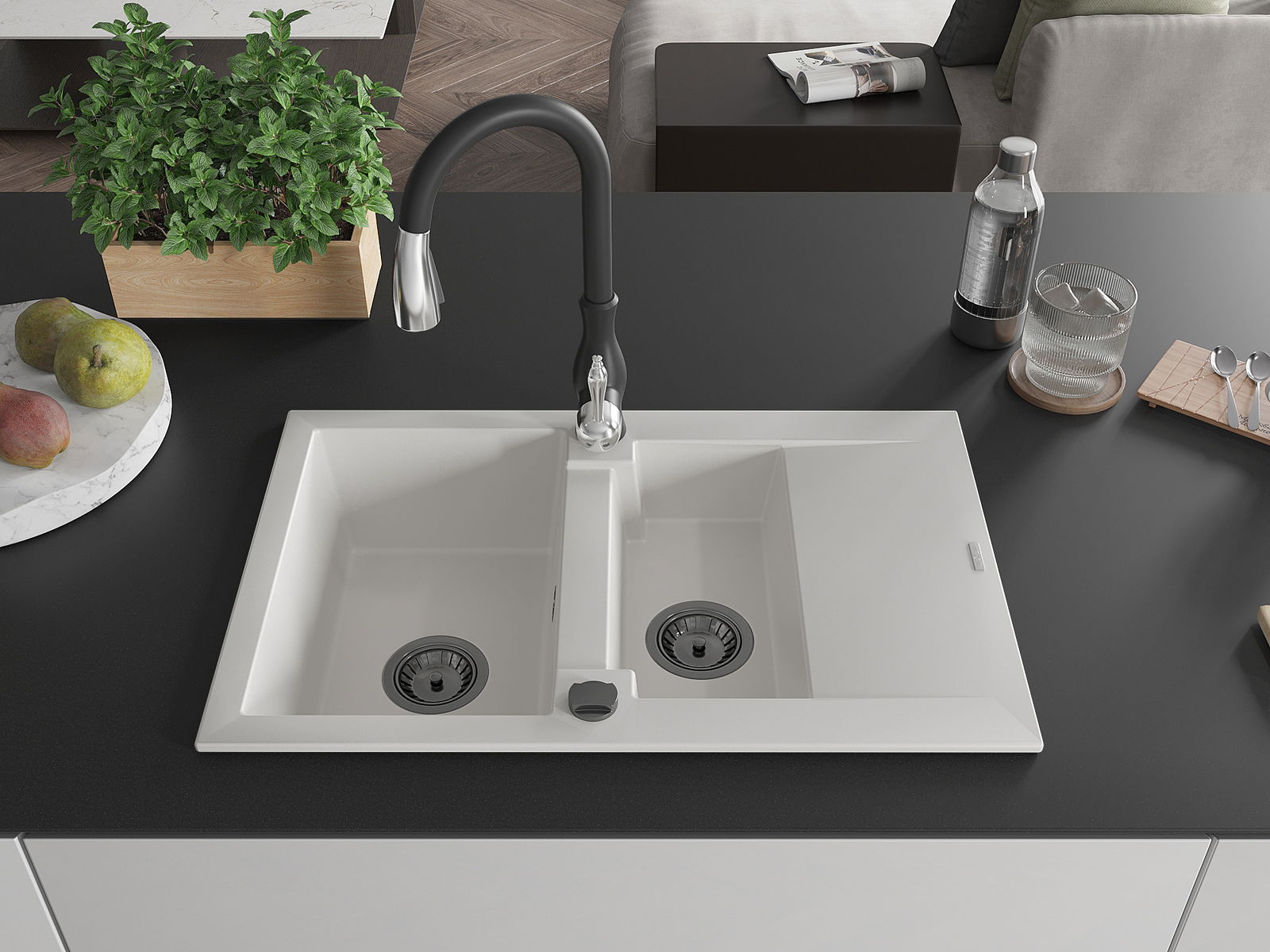 Mexen Gaspar lavello in granito 1,5 vasche con scolapiatti e miscelatore da cucina Savita, bianco - 6507-20-672601-70
