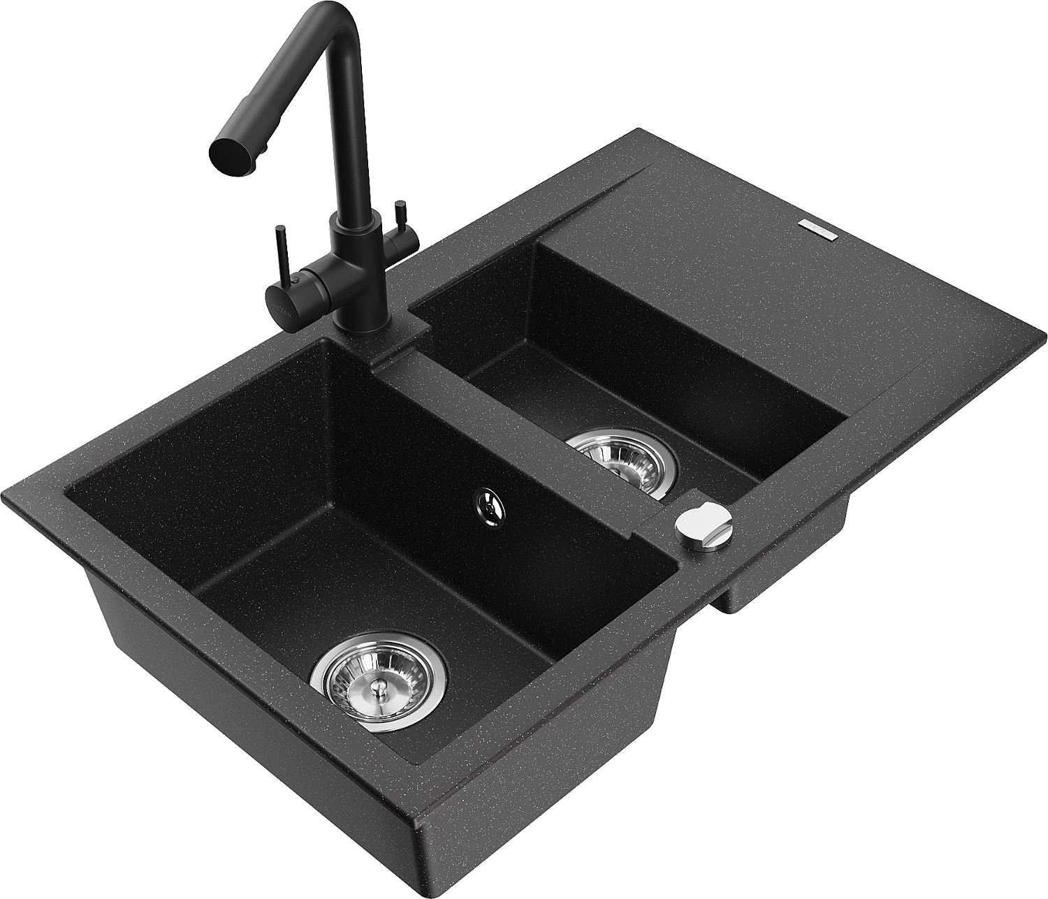 Mexen Gaspar lavello da cucina in granito con 1,5 vasche con sgocciolatoio e rubinetto Duero, nero/argento - 6507-73-671600-70