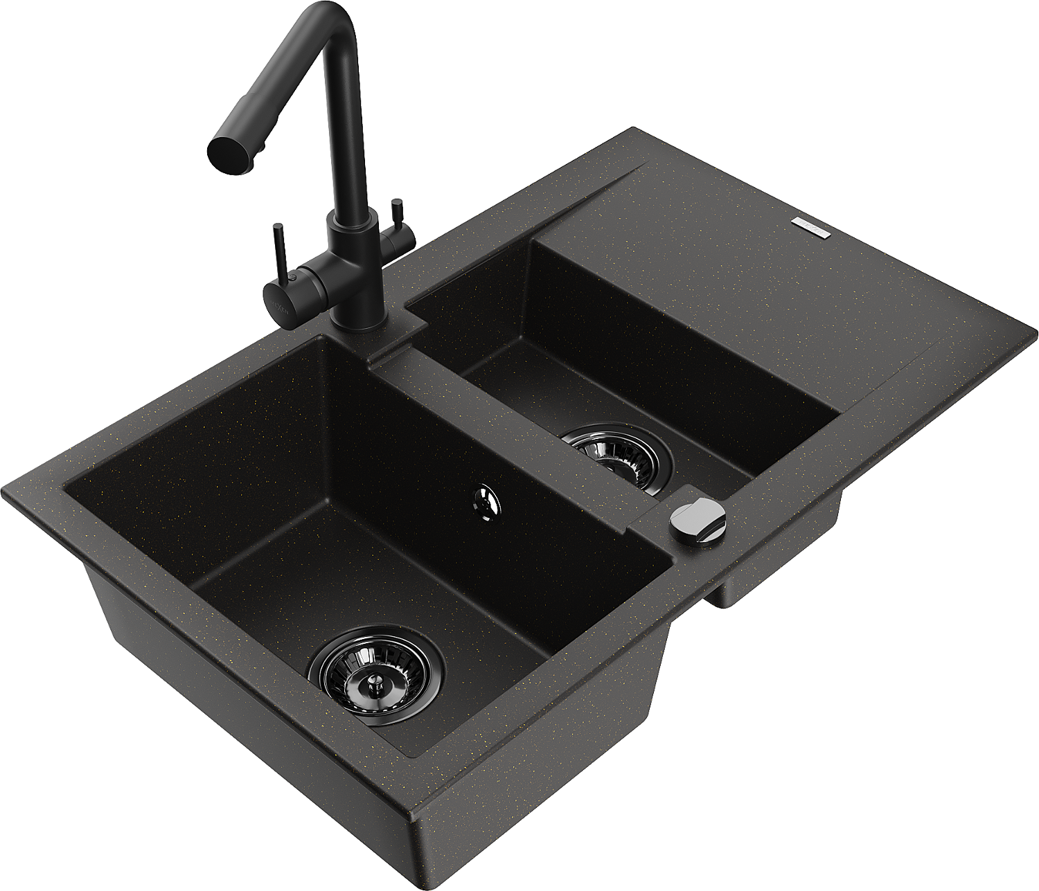 Mexen Gaspar lavello in granito 1,5 vasche con sgocciolatoio e miscelatore da cucina Duero, nero/oro - 6507-75-671600-70-B