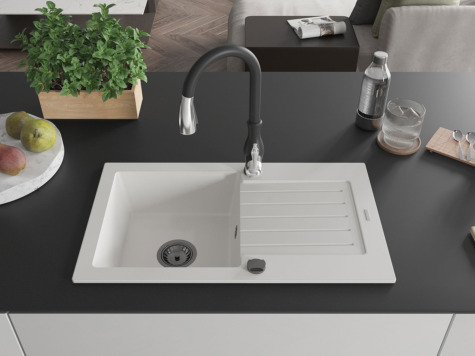 Il lavello è realizzato in granito di alta qualità. Rappresenta un complemento elegante e, soprattutto, pratico per ogni cucina, indipendentemente dal suo stile. L'alta qualità e la durata del granito garantiscono un utilizzo che dura per molti anni.