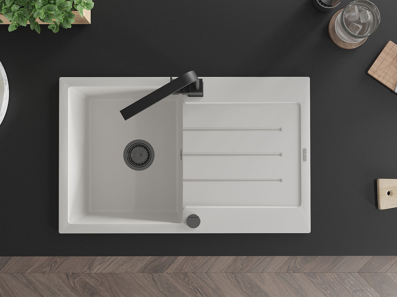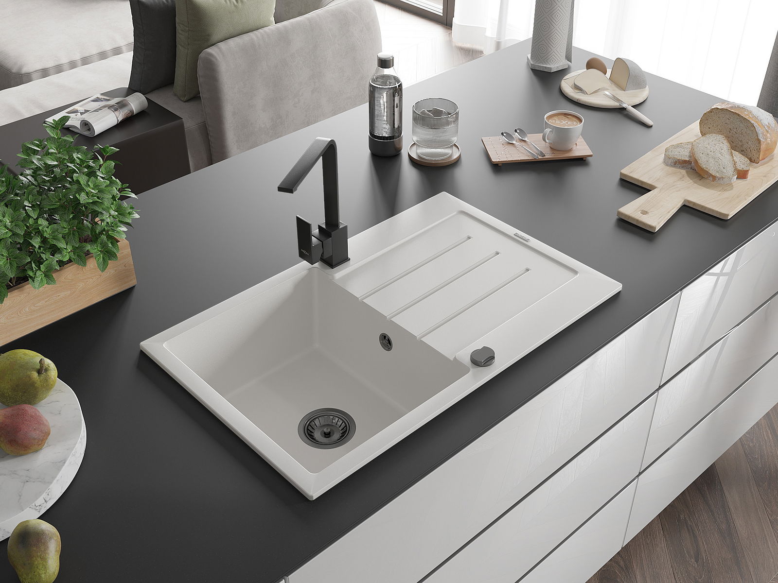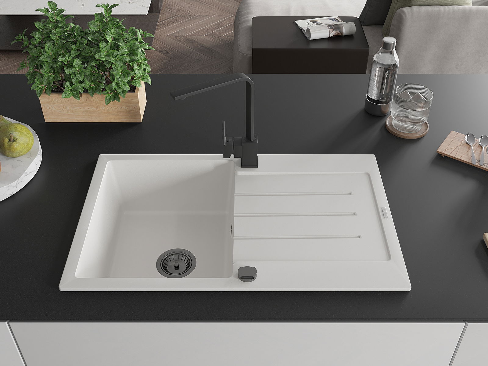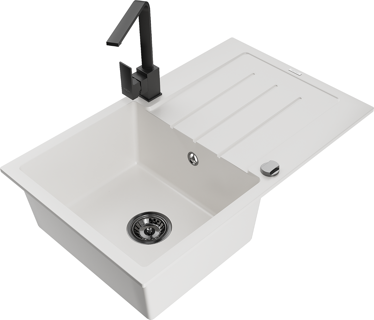 Mexen Bruno lavello in granito 1-vasca con scolapiatti e rubinetto cucina Rita, bianco - 6513-20-670300-70