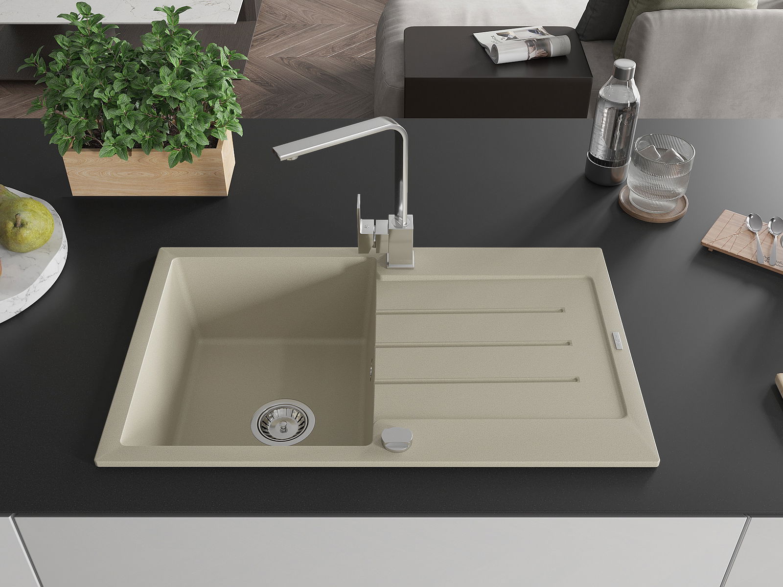 Il lavello è realizzato in granito di alta qualità. Rappresenta un complemento elegante e, soprattutto, pratico per ogni cucina, indipendentemente dal suo stile. L'alta qualità e la durata del granito garantiscono un utilizzo che dura per molti anni.