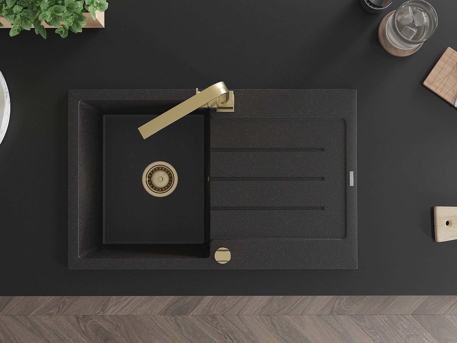 Mexen Bruno lavello in granito monocamera con scolapiatti e rubinetto da cucina Rita, nero/metallo argento - 6513-73-670300-50