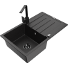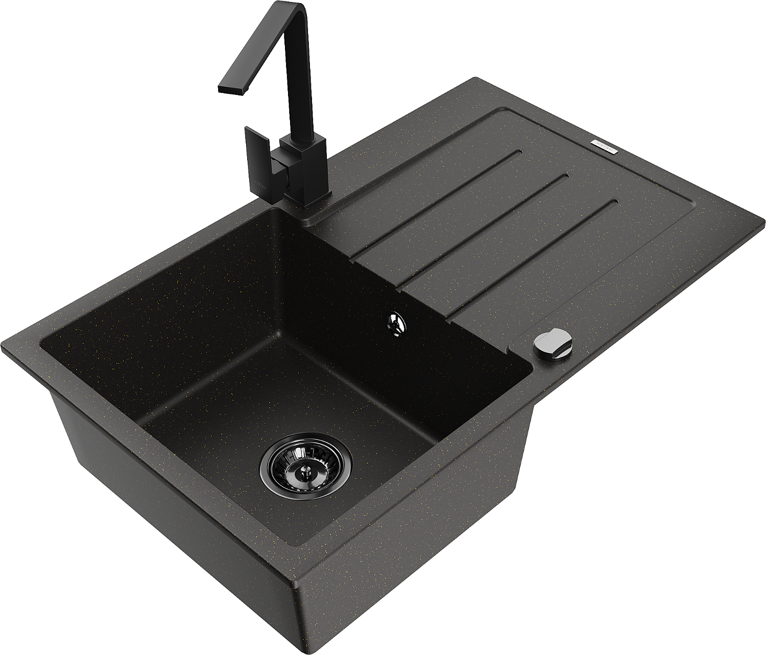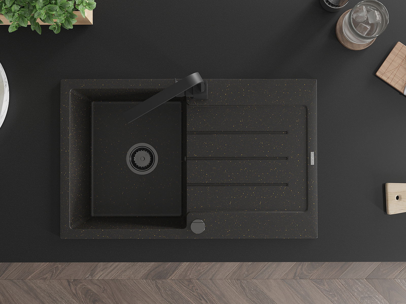 Mexen Bruno lavello in granito a 1 vasca con scolapiatti e rubinetto da cucina Rita, nero/oro metallizzato - 6513-75-670300-70-B