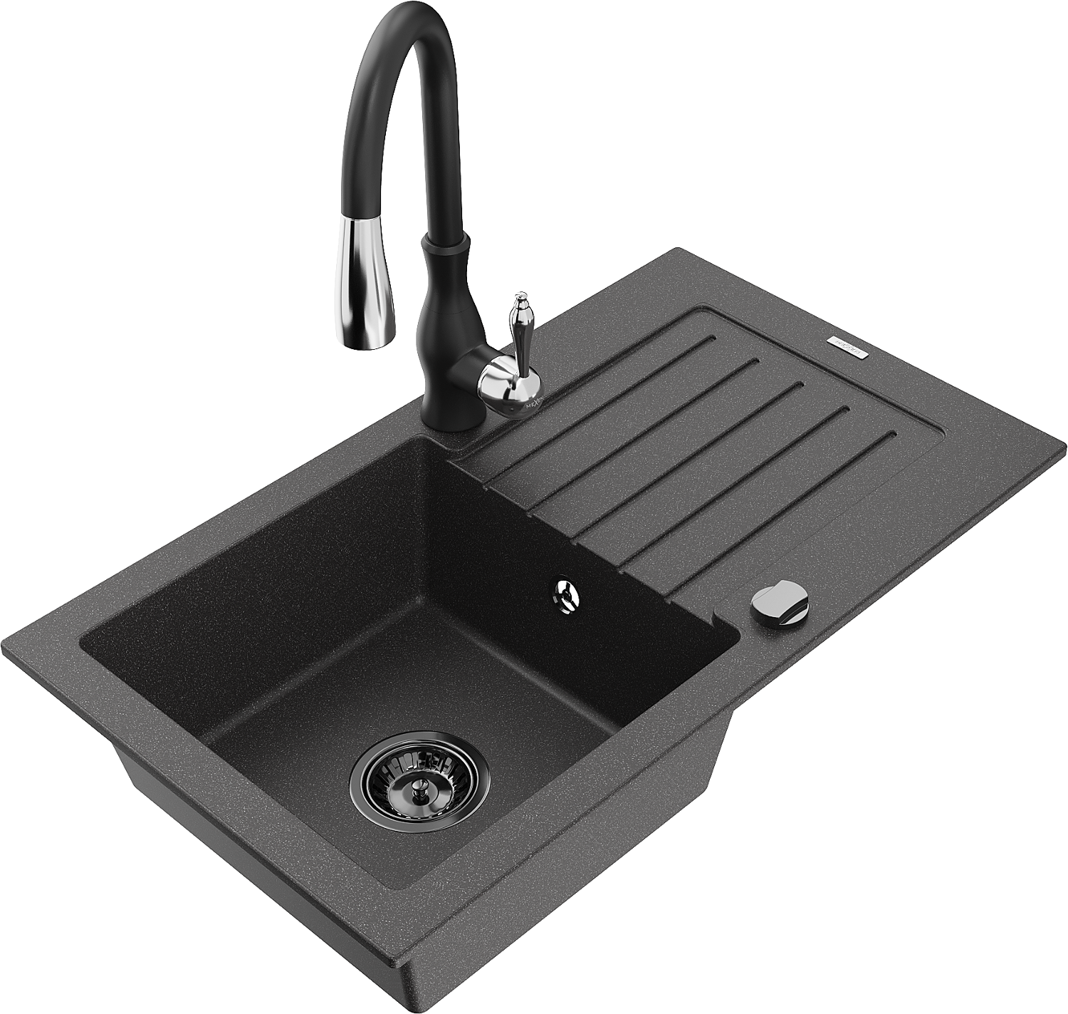 Mexen Pablo lavello in granito a 1 vasca con sgocciolatoio e rubinetto da cucina Savita, nero maculato - 6510-76-672601-70-B