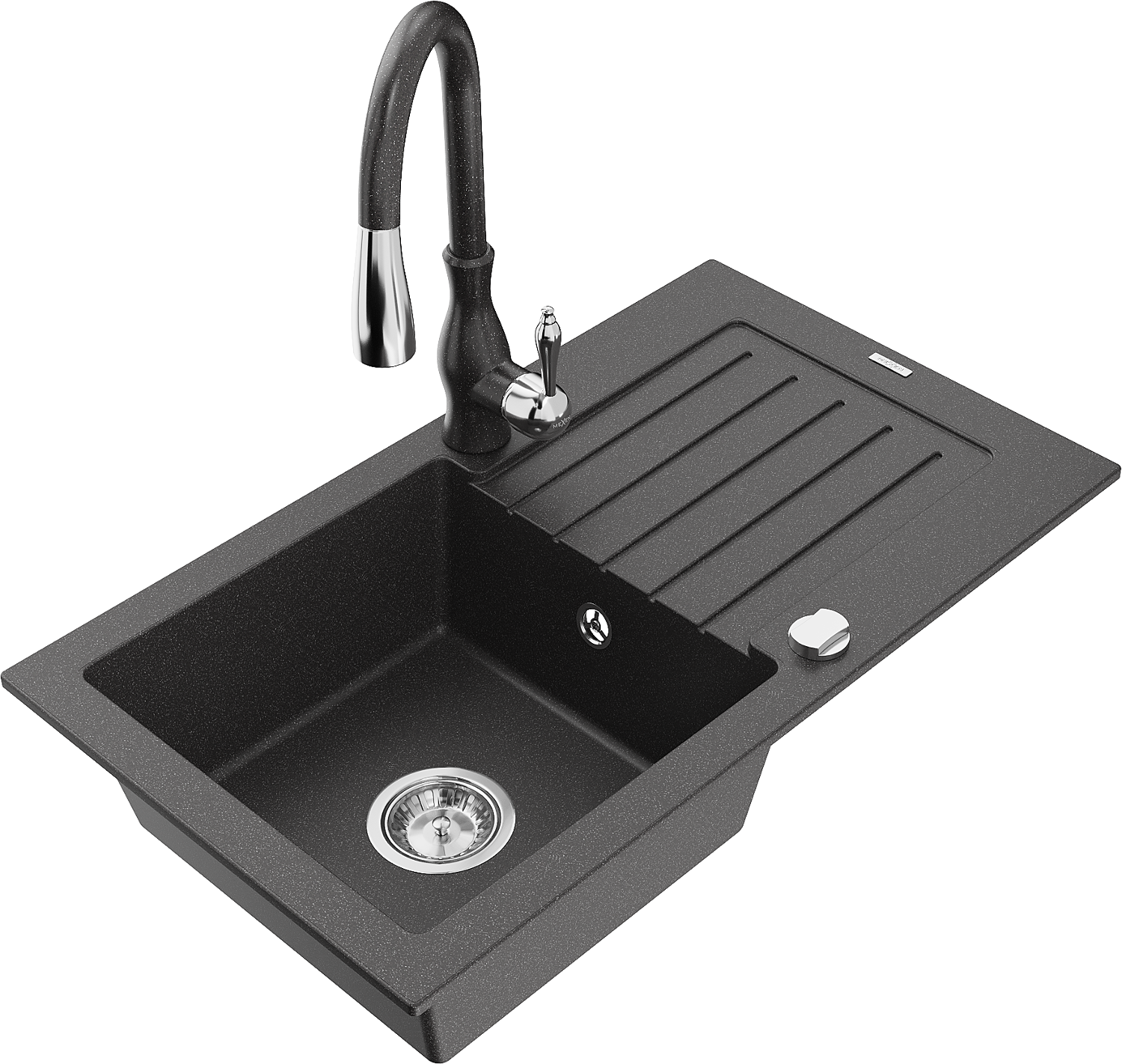 Mexen Pablo lavello in granito 1-vasca con gocciolatoio e rubinetto da cucina Savita, nero maculato - 6510-76-672601-76