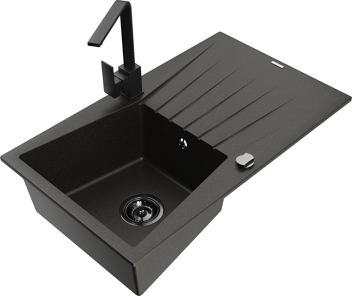 Mexen Cesar lavello in granito 1-vasca con scolapiatti e miscelatore da cucina Rita, nero/oro metallico - 6514-75-670300-70-B