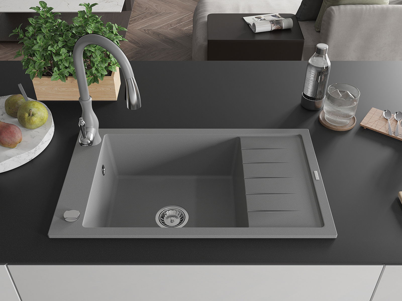 Mexen Elias lavello in granito a 1 vasca con sgocciolatoio e rubinetto da cucina Savita, grigio - 6511-71-672601-71