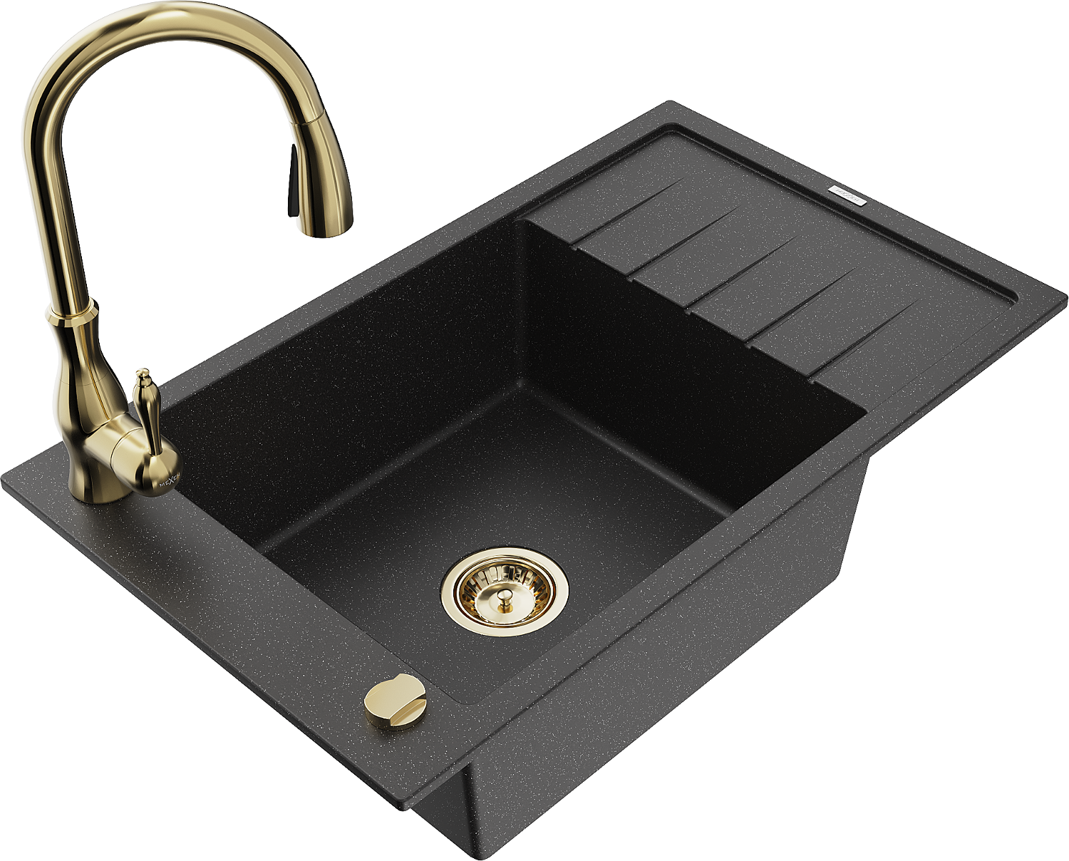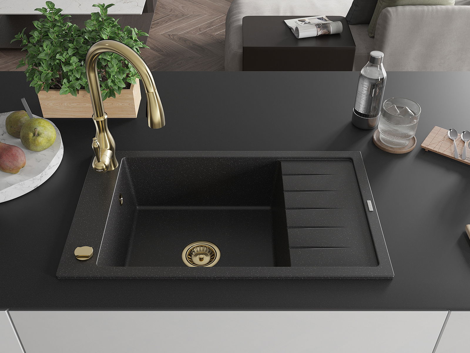 Mexen Elias lavello in granito a 1 vasca con sgocciolatoio e rubinetto da cucina Savita, nero/metallizzato argento
