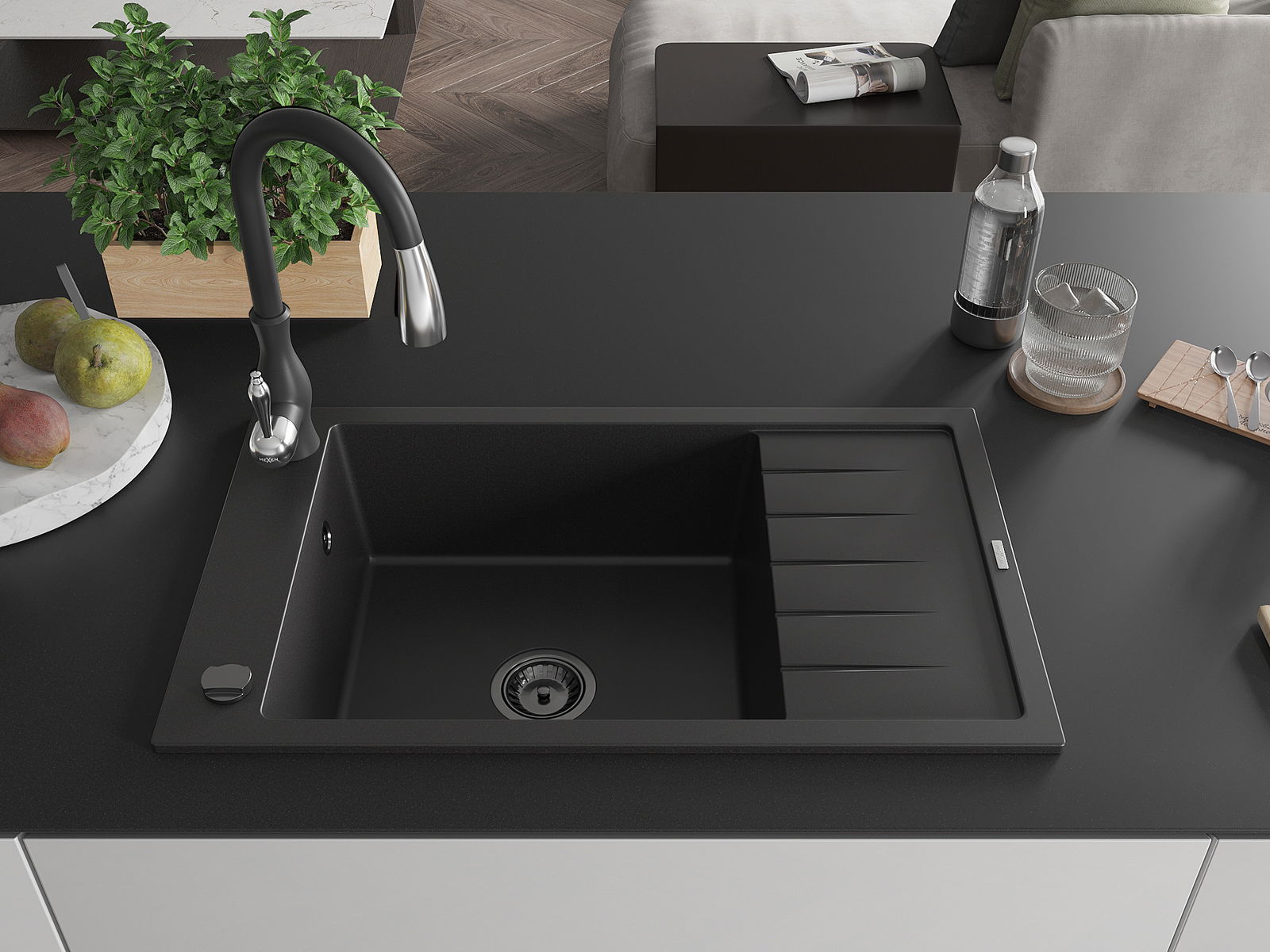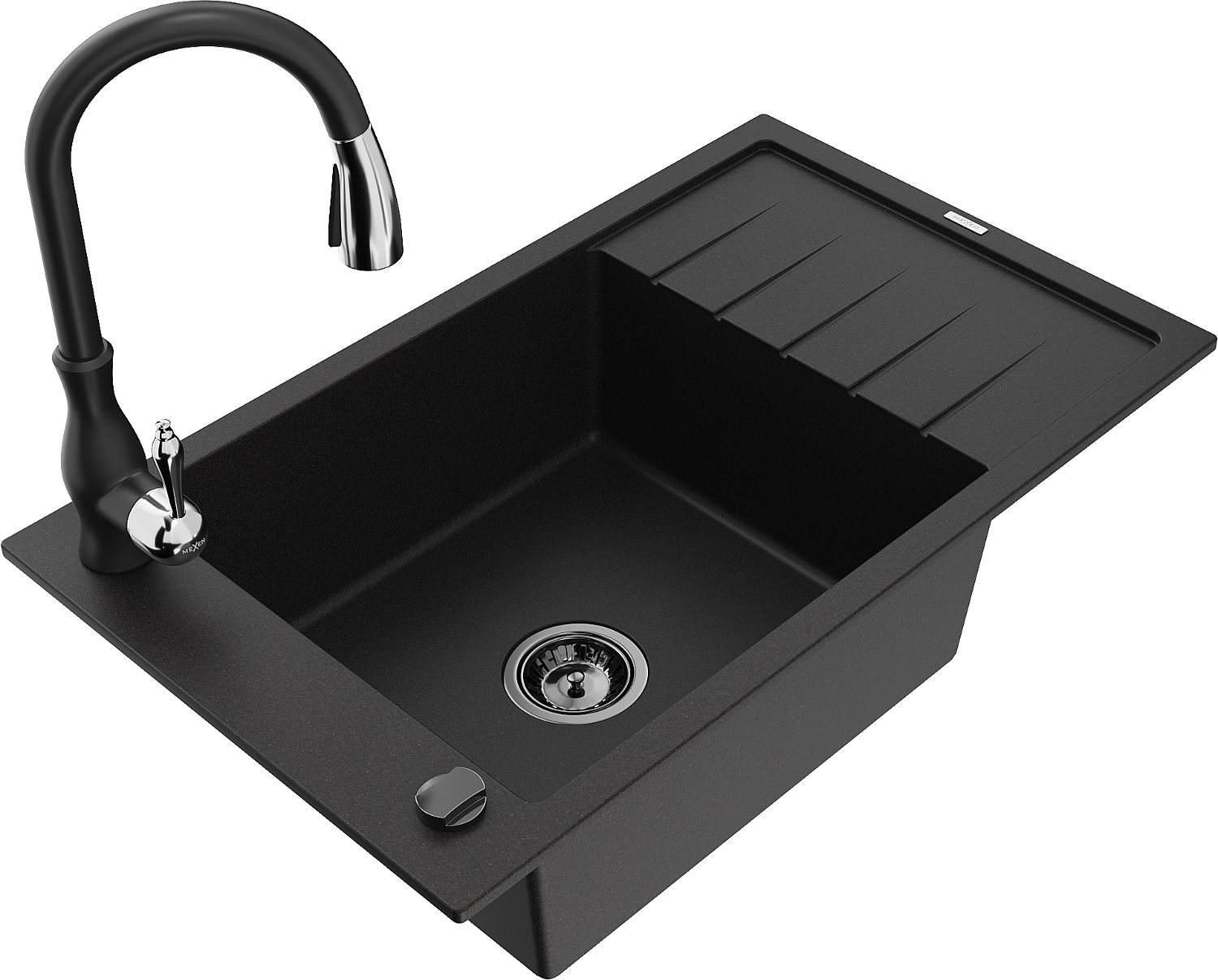Mexen Elias lavello in granito a 1 vasca con scolapiatti e rubinetto da cucina Savita, nero - 6511-77-672601-70-B