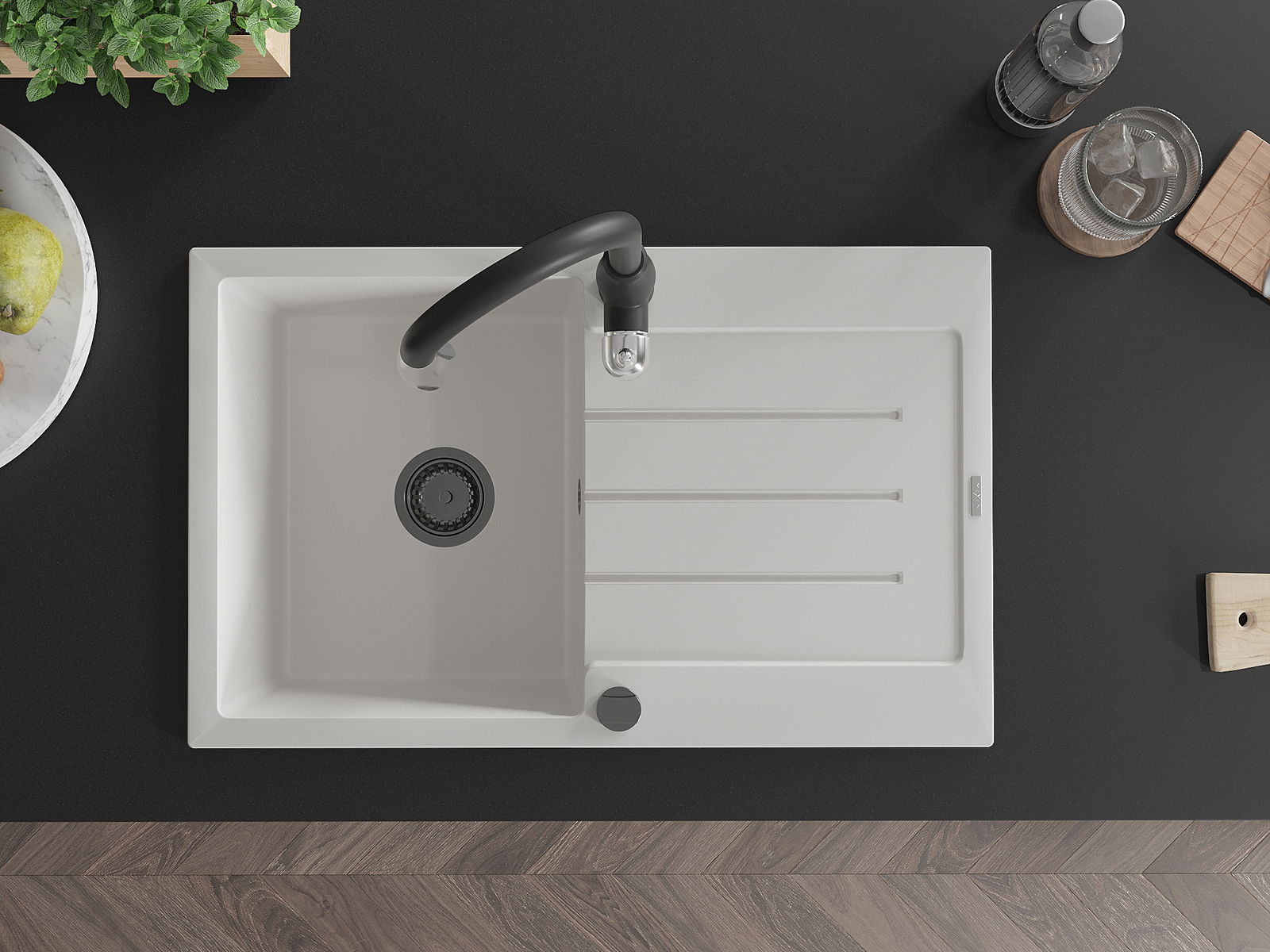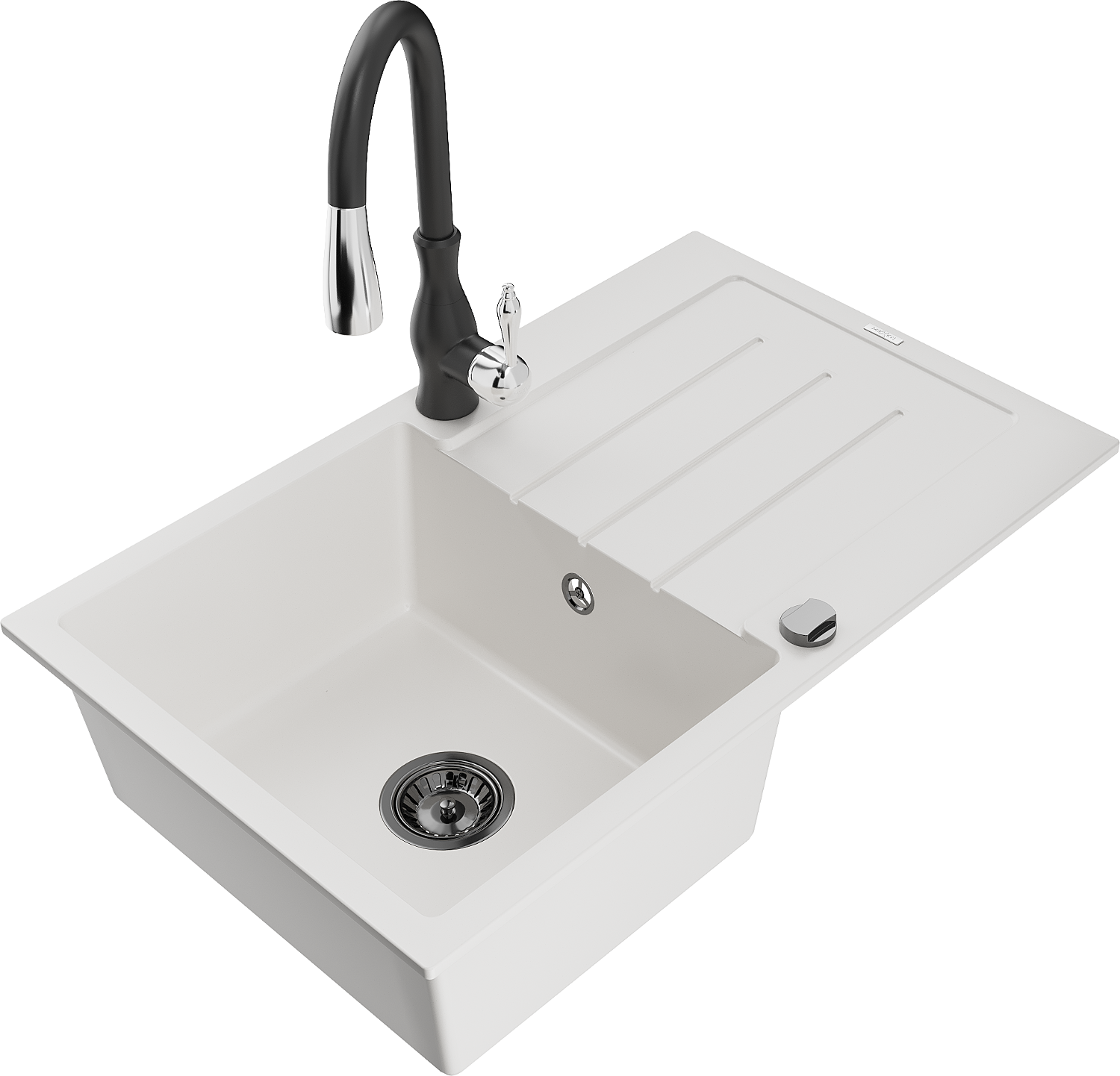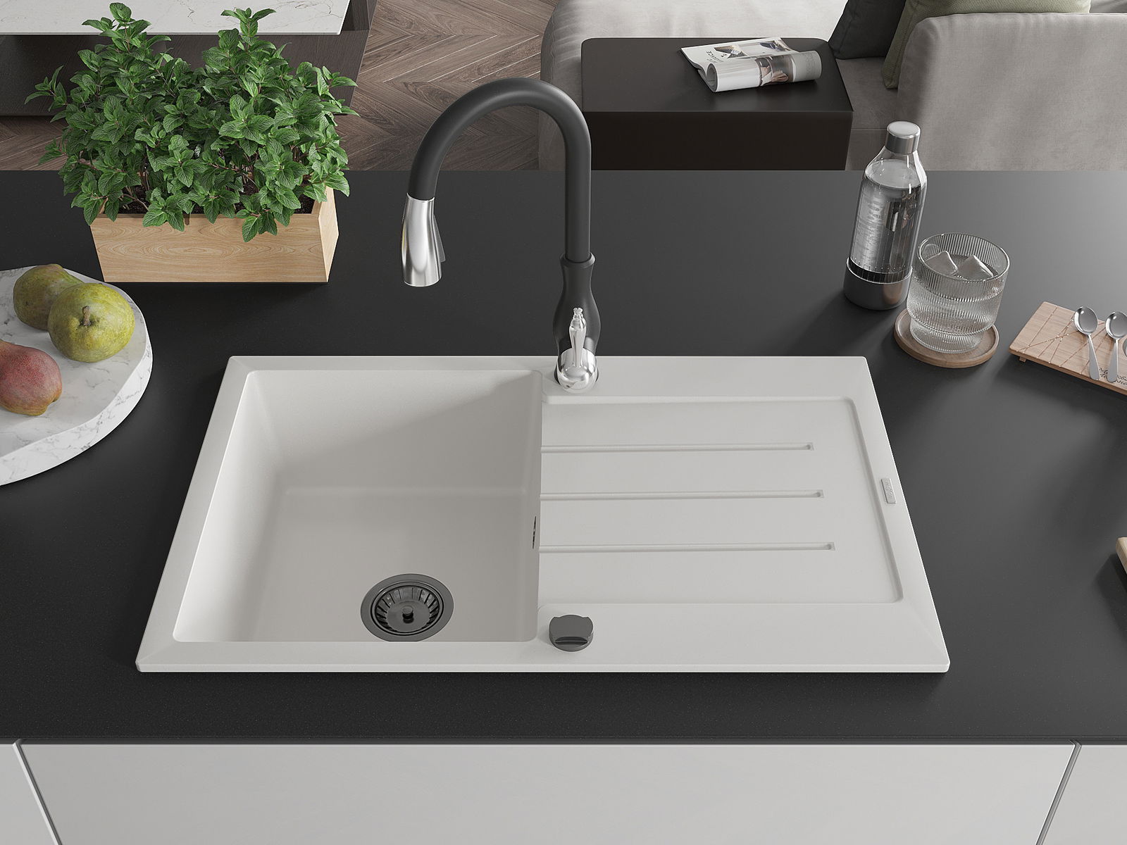 Mexen Bruno lavello in granito 1-vasca con sgocciolatoio e rubinetto da cucina Savita, bianco - 6513-20-672601-70