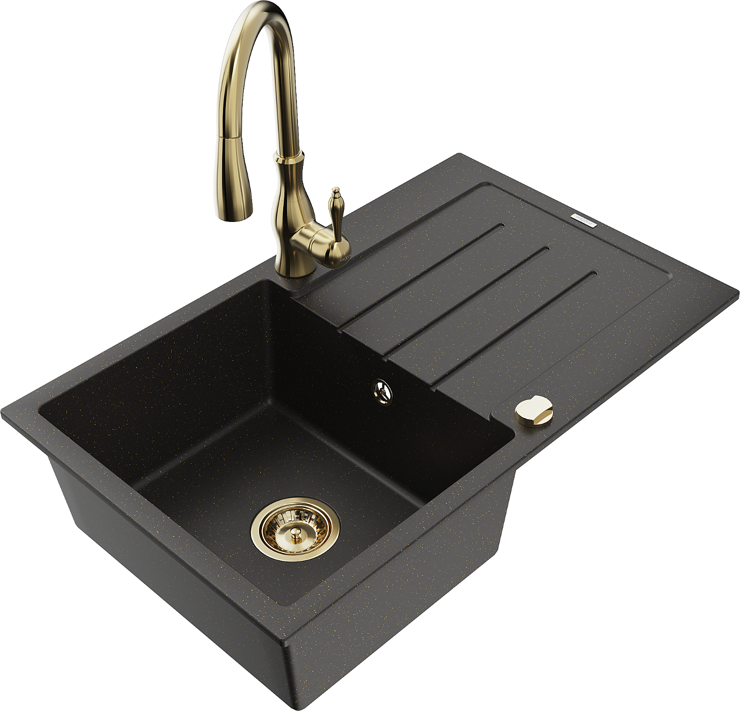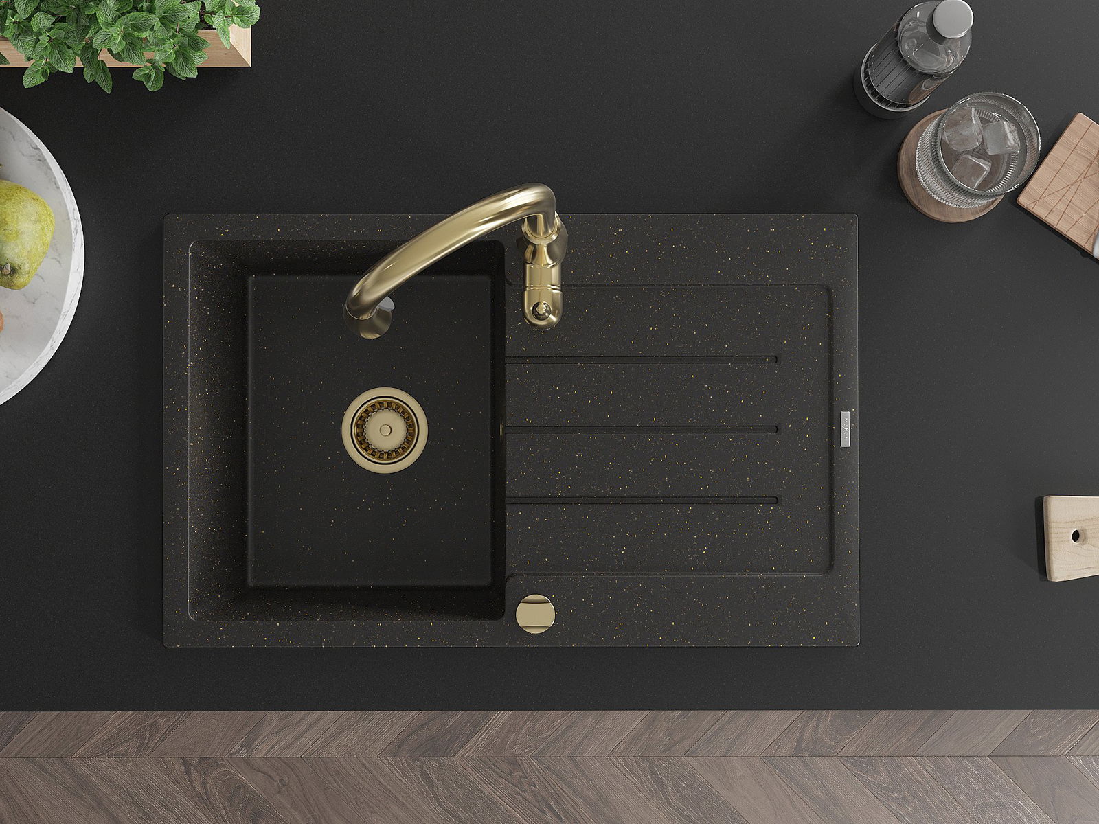 Mexen Bruno lavello in granito a 1 vasca con sgocciolatoio e miscelatore da cucina Savita, nero/oro metallizzato