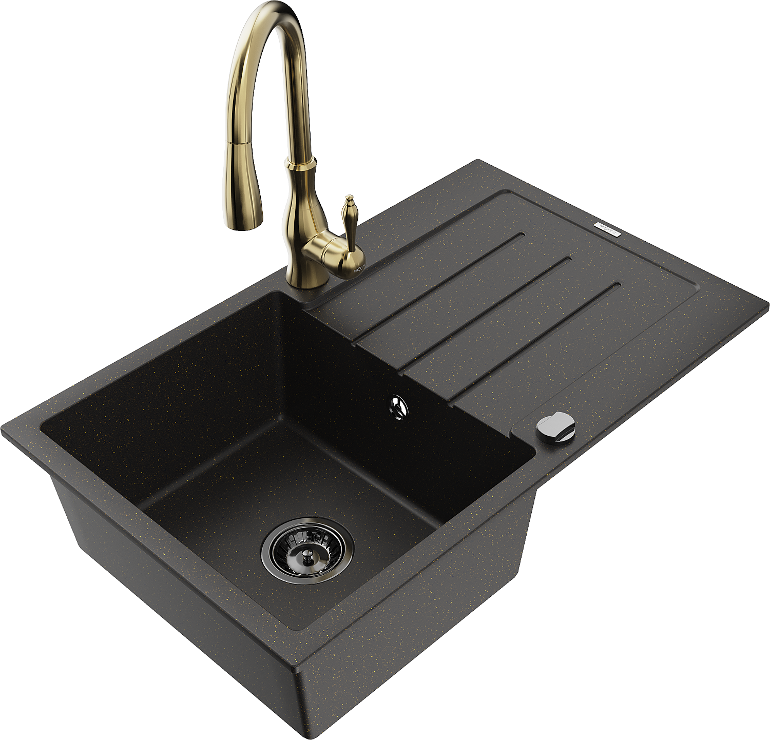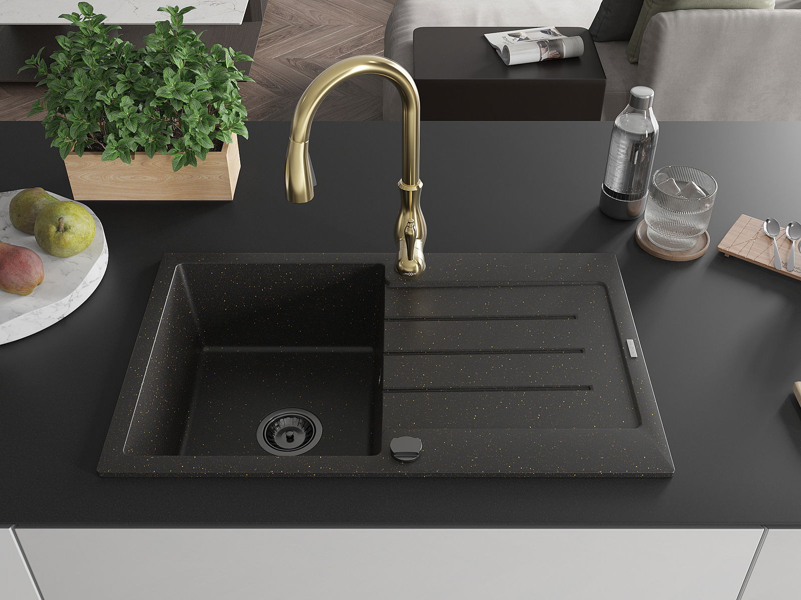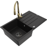 Mexen Bruno lavello in granito a 1 vasca con scolapiatti e rubinetto da cucina Savita, nero/oro metallico - 6513-75-672601-50-B