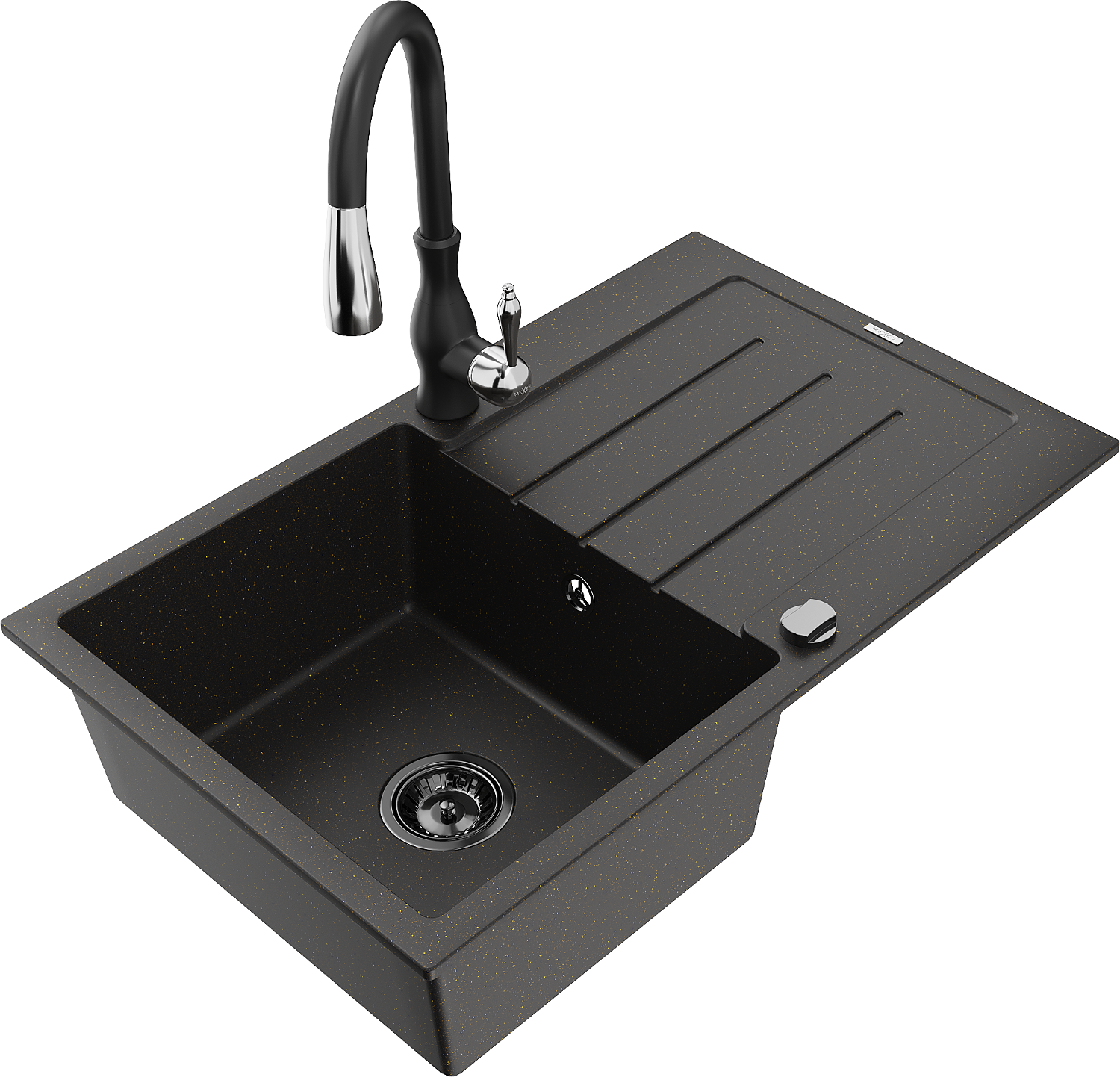 Mexen Bruno lavello in granito 1 vasca con sgocciolatoio e rubinetto da cucina Savita, nero/oro metallico - 6513-75-672601-70-B