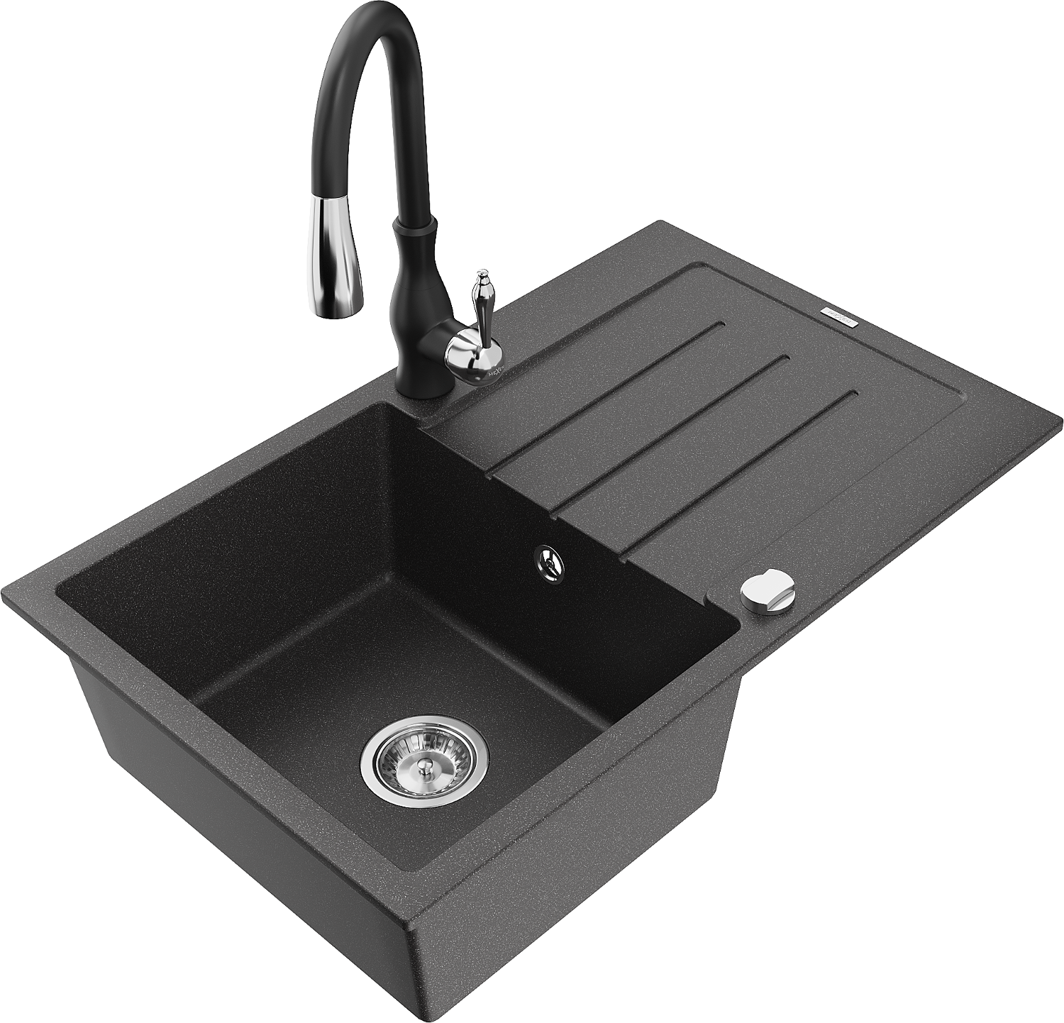 Mexen Bruno lavello in granito a 1 vasca con scolapiatti e miscelatore da cucina Savita, nero maculato - 6513-76-672601-70