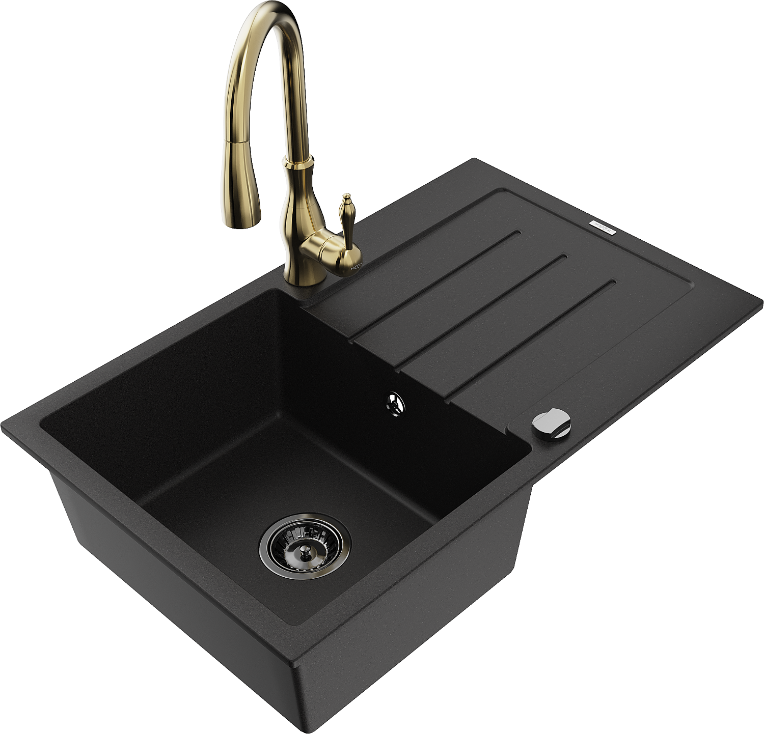 Mexen Bruno lavello in granito a 1 vasca con gocciolatoio e rubinetto da cucina Savita, nero - 6513-77-672601-50-B