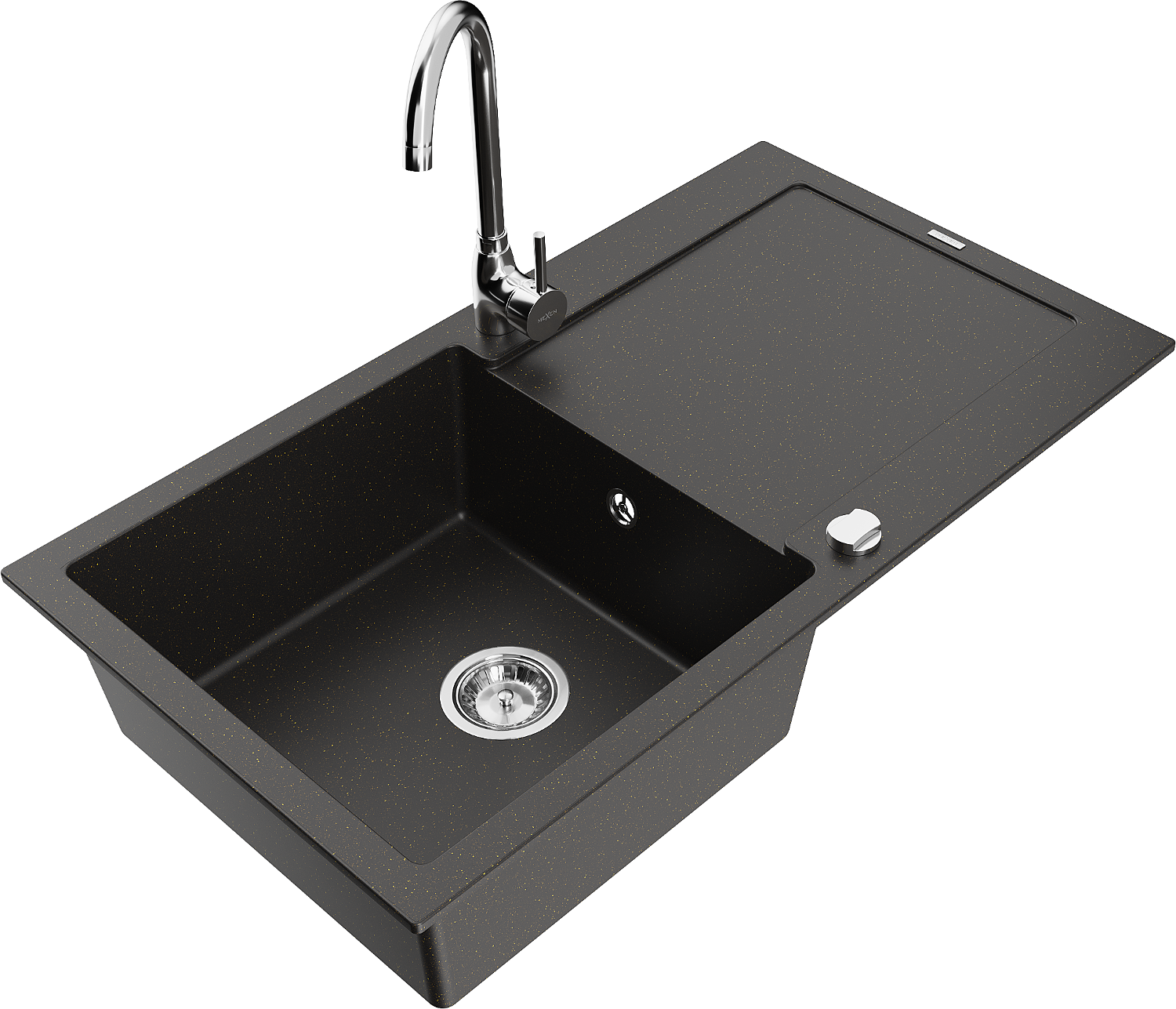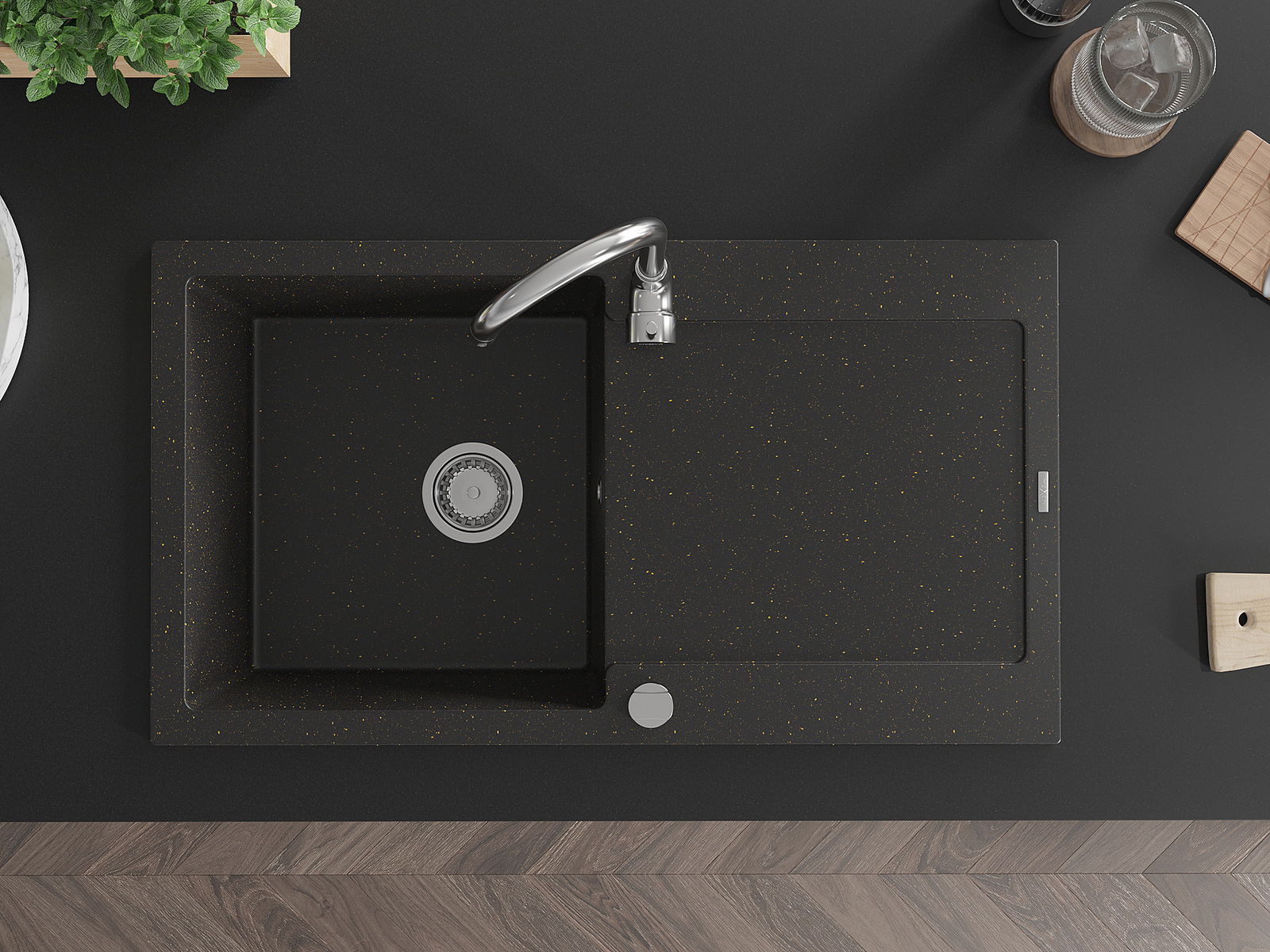 Mexen Leo lavello in granito a 1 vasca con sgocciolatoio e rubinetto da cucina Telma, nero/oro metallizzato - 6501-75-670200-00