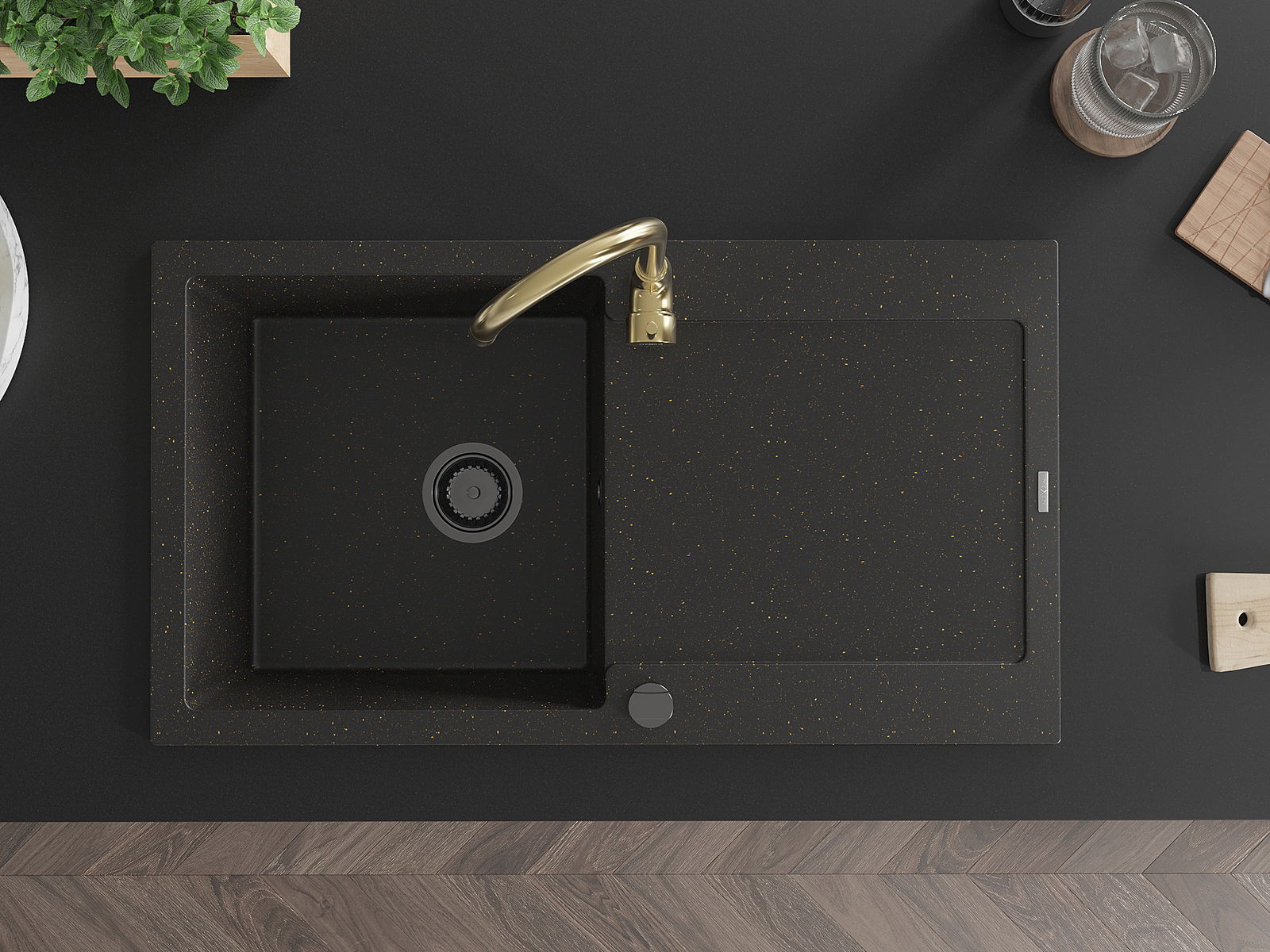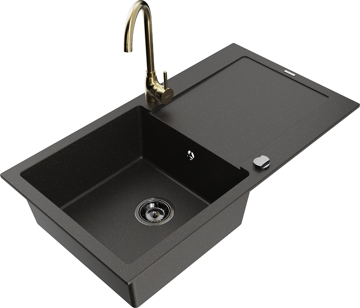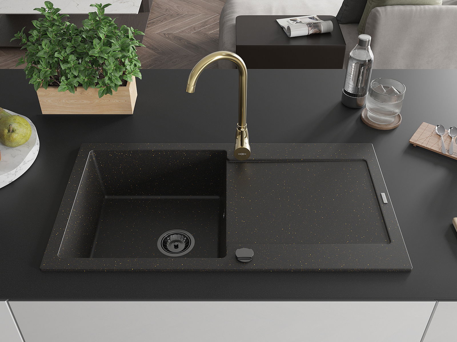 Mexen Leo lavello in granito a 1 vasca con scolapiatti e rubinetto da cucina Telma, nero/oro metallizzato - 6501-75-670200-50-B