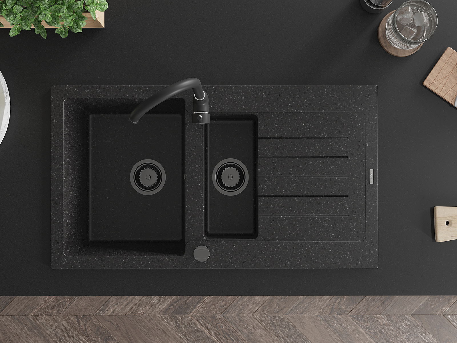 Mexen Matias lavello in granito 1,5 vasca con gocciolatoio e rubinetto da cucina Telma, nero/argento - 6502-73-670200-70-B