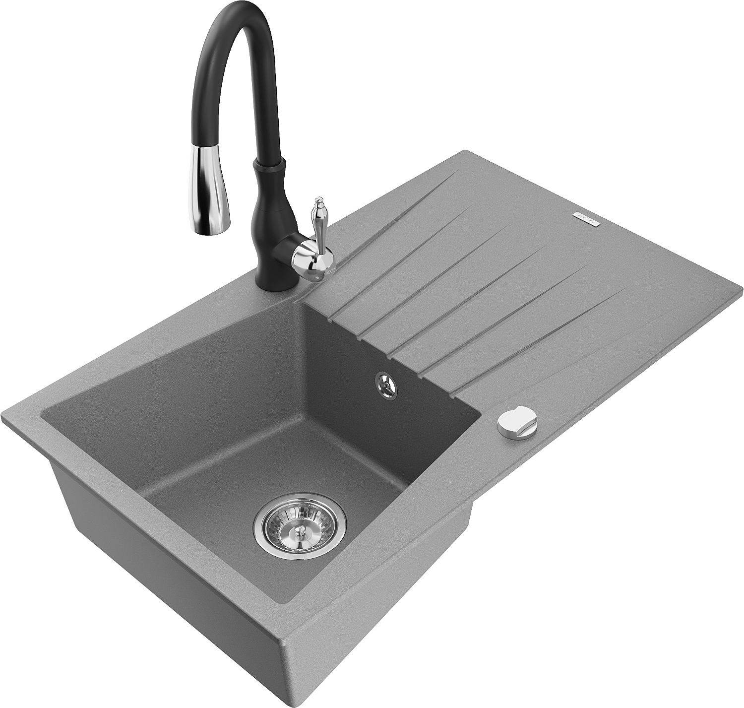 Mexen Cesar lavello da cucina in granito a 1 vasca con gocciolatoio e rubinetto cucina Savita, grigio - 6514-71-672601-70
