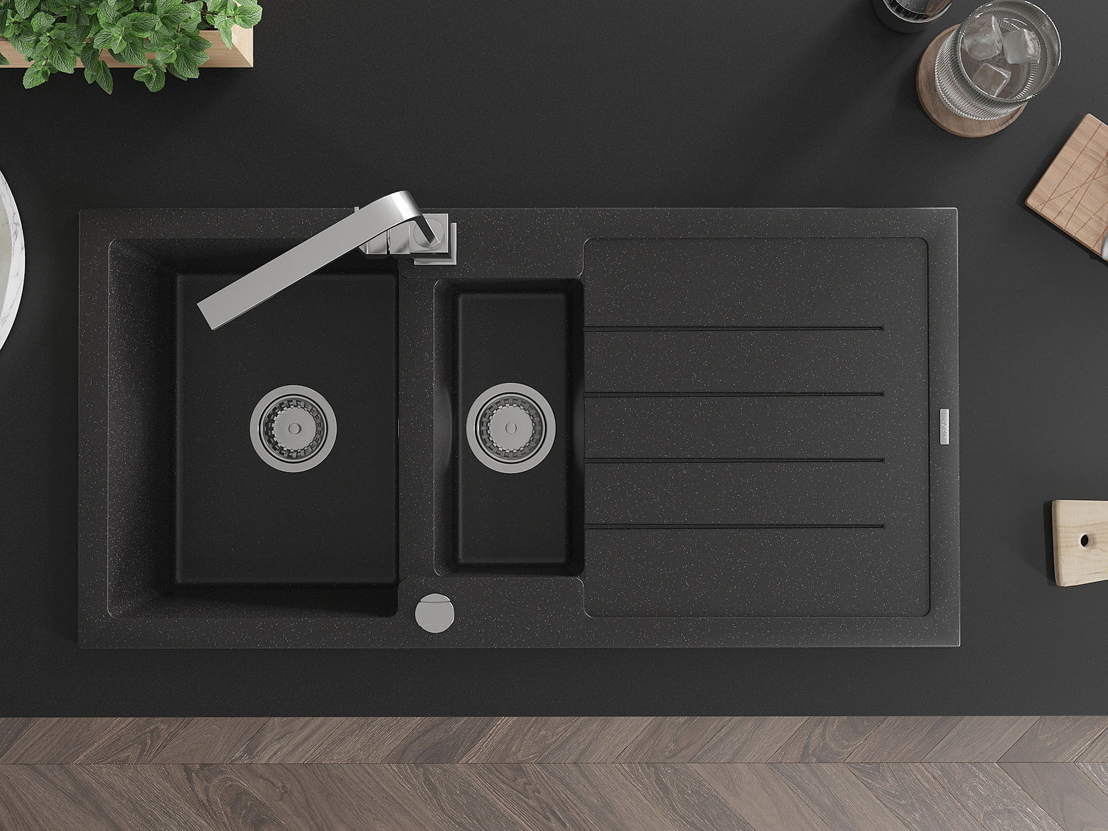 Mexen Andres lavello in granito a 1,5 vasche con sgocciolatoio e rubinetto da cucina Rita, nero/argento metallizzato