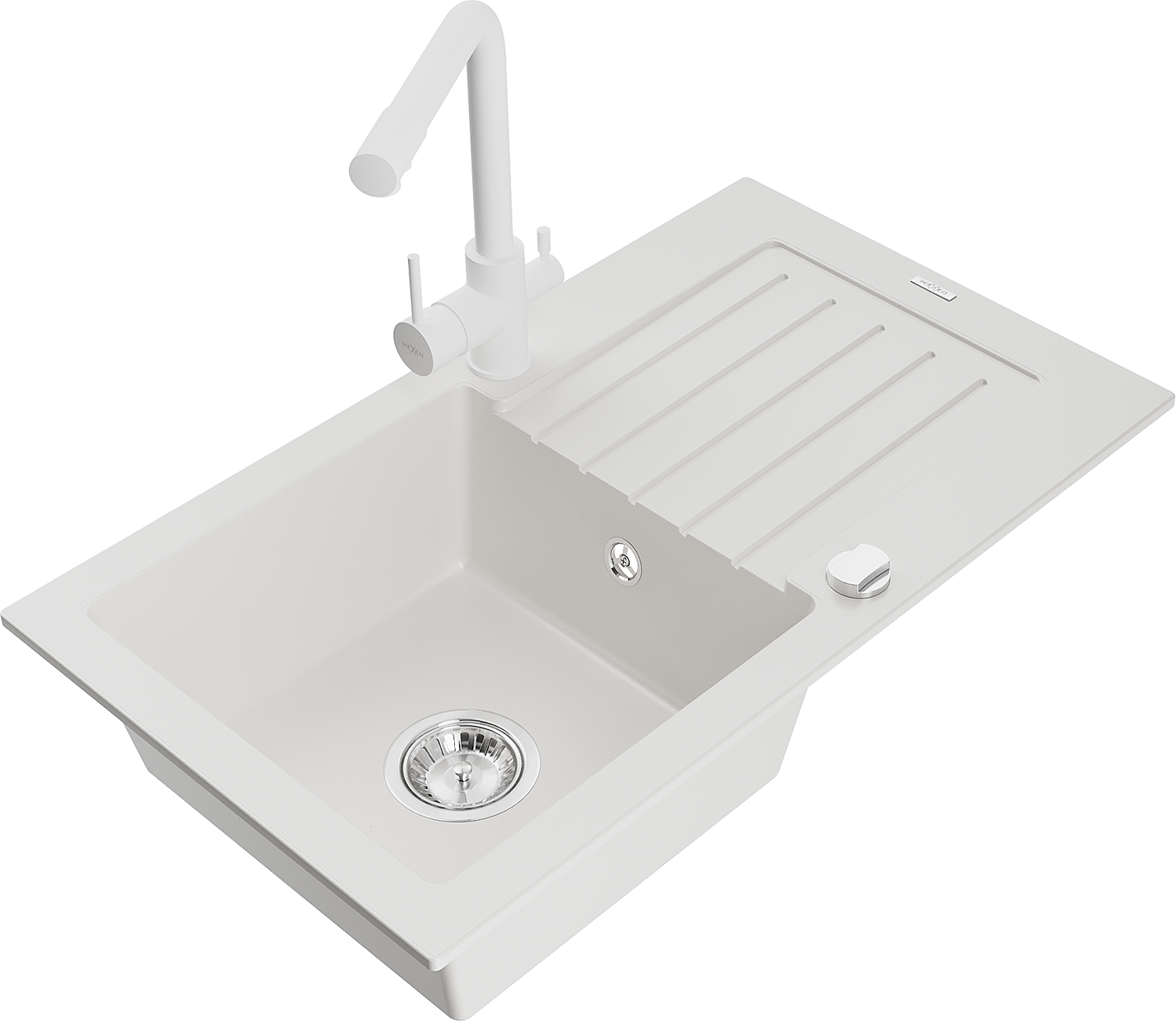 Mexen Pablo lavello in granito 1-vasca con scolapiatti e rubinetto da cucina Duero, bianco - 6510-20-671600-20